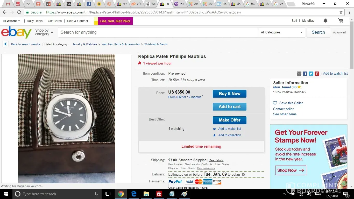 This ebay user ston_tamel is selling a replica Patek Philippe Nautilus. This is a Federal Crime and also a serious Crime in the State of California. In addition, Patek Philippe can sue the seller under the Lanham Act.