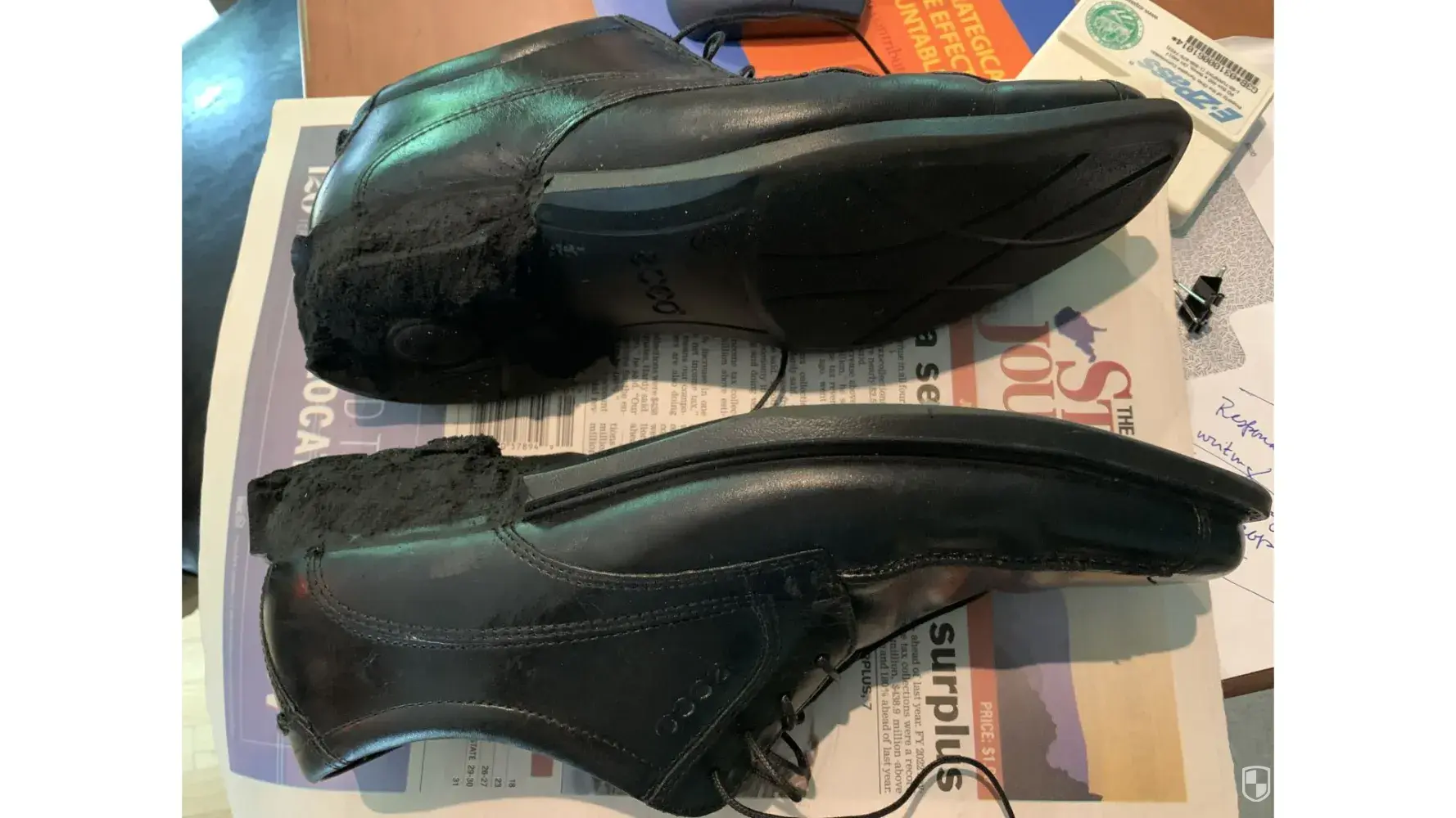 Because today was a really warm day, I decided to wear my Ecco shoes. I was visiting a friend at a residence. As I entered her room, I noticed black pieces all over the floor. At first I thought it was earth from outside. Then I realized that soles of my shoes were disintegrating. I tried to remove as much as I could, but then small pieces were all over the floor. Never experienced this. Quite an ordeal getting home.