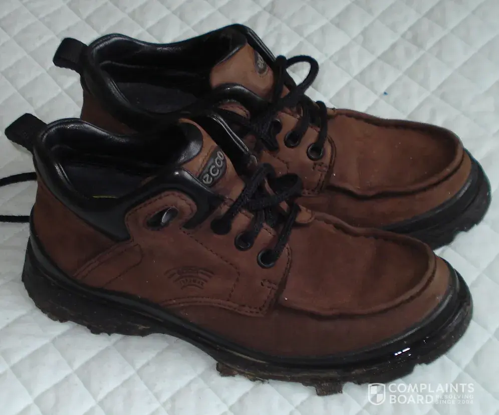 I bought a pair of Ecco boots and after wearing them only a few times the soles completely disintegrated. I thought there must be a fault so sent an e mail with supporting photos to the manufacturer, but having read of so many people having a similar experience and being ignored by Ecco I am no longer expecting a reply. Perhaps all those of us who have had problems with Ecco should contact the trade standards authority. These are certainly not cheap boots and shoes. I have had far better wear from much cheaper boots from Cotton Traders and Millets. As you can see by the photos, although the soles have had it the uppers are in little used condition.
