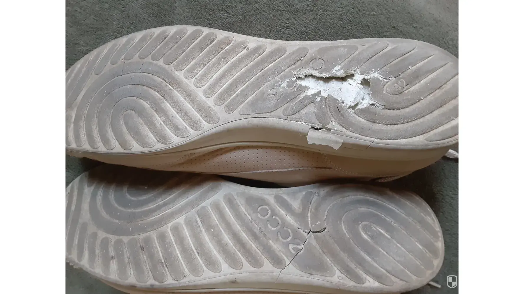 Date June 19th, 2022 the soles of the shoe deteriorated while walking in them and left plastic dust and parts strewn in my daughter's living room. I'm Diabetic and have Severe foot Neuropathy from Diabetes and I wear ECCO because of stable construction, support and good balance I have with them. When your shoes fall apart like this within minutes, I almost fell and I could no longer walk with them on my feet.