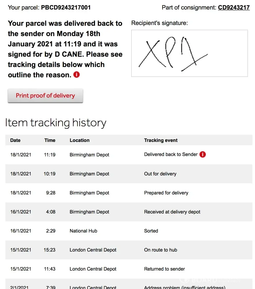 On the 1st of January 2021 the item was attempted to be delivered by the courier, Parcelforce, but failed due to "Insufficient delivery address" I contacted Ecco on the 1st of January and on the 7th of January received response from the customer service informing me that the item was already on route so they couldn't amend the mistake nor they could communicate with the courier. They provide me with an email for liaise with the courier but as I wasn't the original sender I couldn't amend the address myself. I contacted Ecco and provided with the right details and the additional details of my next door neighbour, I contacted them on three more occasions.