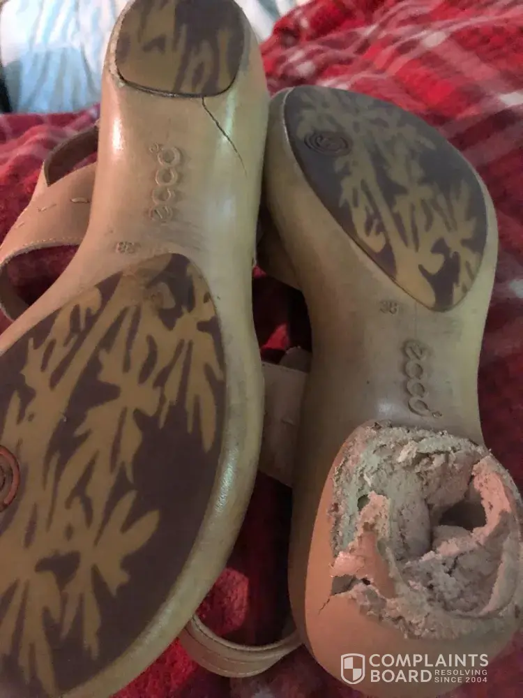 I normally am fond of Ecco shoes - having bought many pairs over the years - last year, a pair of sandals had the sole literally "chunk" apart - crack and break apart. I sadly threw the shoes out thinking they had reached the "end" of their life span. Yesterday, the very same thing happened on another pair of Ecco sandals - a chunk of the right heel came out and left a pulverized and chunky mess on the floor - yikes - glad I didn't turn my ankle!