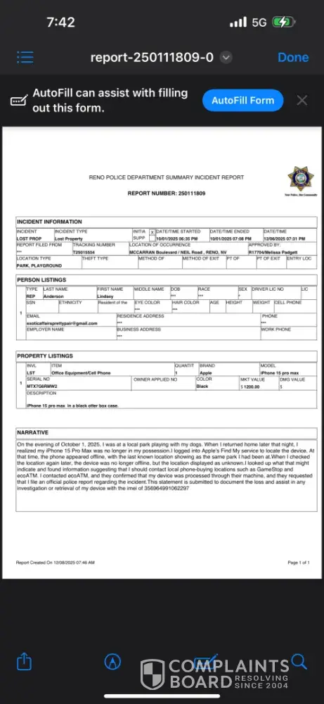 EcoATM confirmed they found my stolen phone on 10/22/25 and made me jump through months of repeated proof-of-ownership requests (ID, police report, Apple account proof). During this time I received an alert someone tried accessing my account and EcoATM ignored my concerns. After months they claimed they shipped my phone back — but I received the wrong phone with a different IMEI/serial number. This is negligent handling of stolen property and a serious privacy/security issue. I want my correct phone returned immediately, a prepaid return label for the wrong device, and written confirmation my phone was not accessed or tampered with.