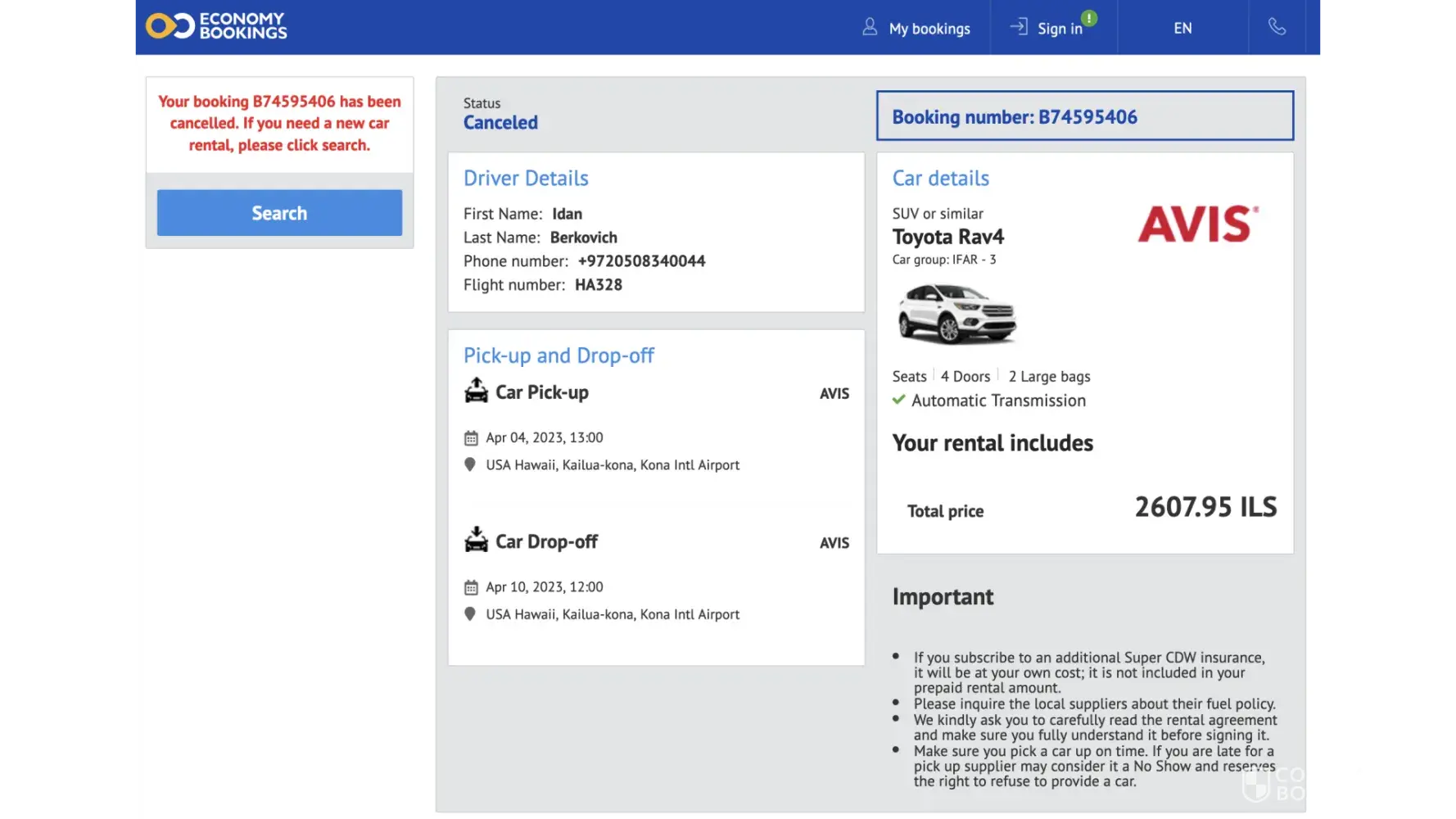My flight got 8 hours delay, so I let Economy Bookings know about it enough time in advance asking if I should cancel or amend my reservation an what will be the costs, and they simply cancelled my reservation without any refund claiming that the car supplier can't hold the reservation for more than 1 hour!