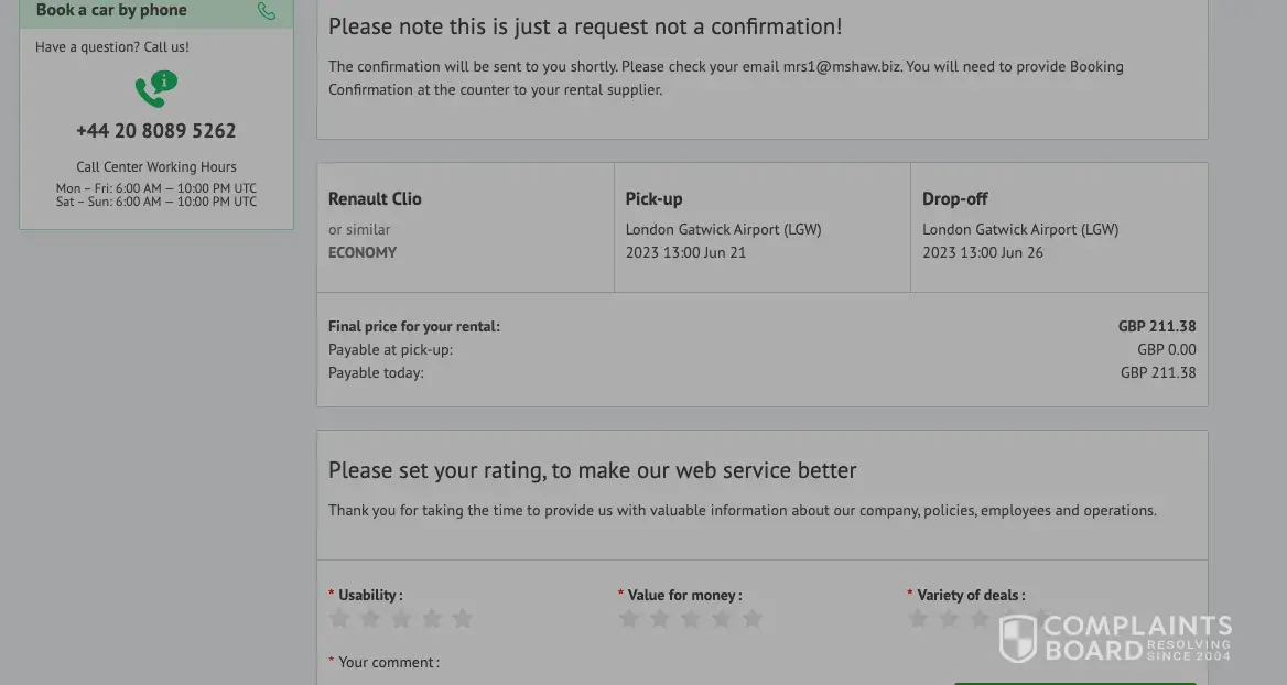 This is the standard email for complaints I have been using it. It takes 4-6 weeks and then they don’t deal with it correctly and you start the process again. I’m owed a lot of money because of their mistake not to mention having to find another vehicle at 11.15 pm with three tired children. Feel free to get in touch EconomyBookings and not via an automated response system. Disgraceful