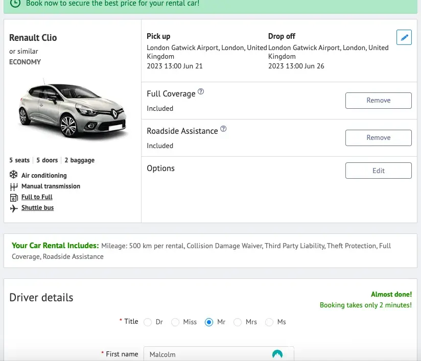 On the economy booking site, I booked a car with insurance, a second driver and a cancellation fee (in case I needed it.)