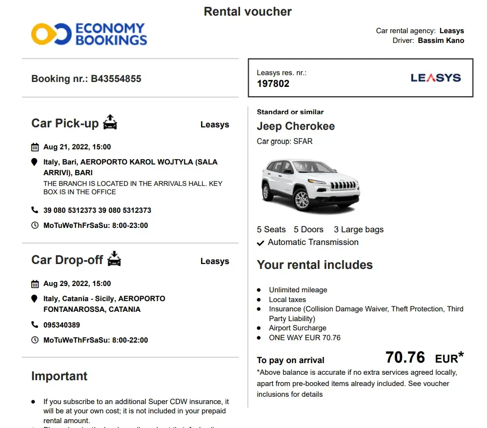 leasys car rental booking B43554855