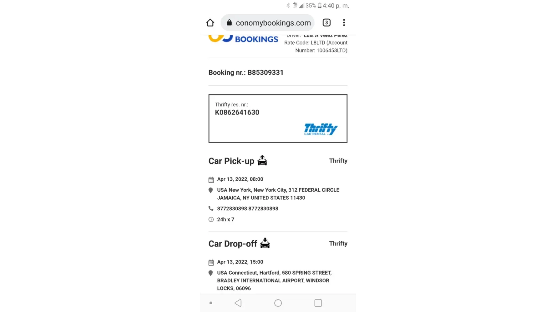 El dÃa 1 de abril 2022 hice una reservación para recoger un carro en el aeropuerto Jonh F. Kennedy el 13 de abril a las 8:00am y entregarlo el mismo dÃa a las 3:00pm en el aeropuerto Bradley de Hartford Ct. No me dieron el carro porque olvide mis tarjetas de crédito. La señora de la oficina de Trifthy rent cae.no quiso aceptar la tarjeta de mi esposa y nos quedamos varados en New York por más de 8 horas por ese incidente. El número de Booking es. B85309331. Yo pague 198.48 por la reservación y he tratado de recuperar mi dinero y nadie me a ayudado. Espero y se me devuelva el dinero.