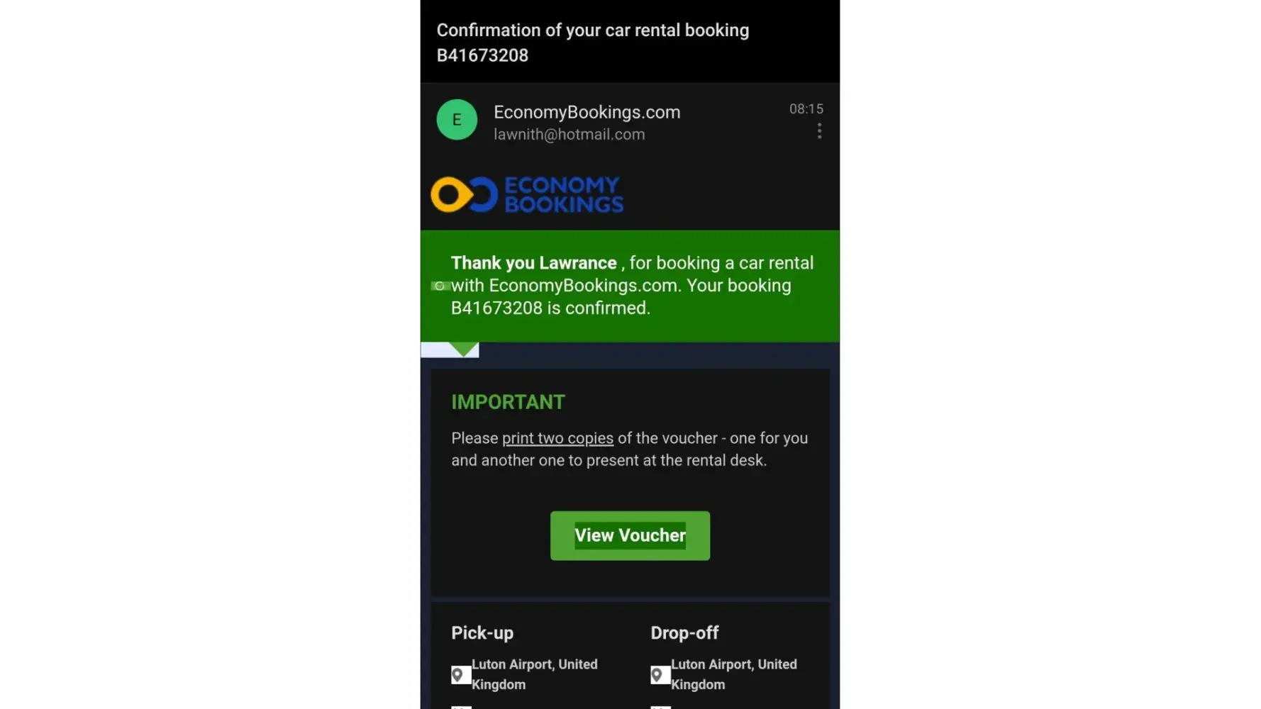 On Voucher it is clearly written their office works till 22.30 but they still refused to give me the car- despite my reservation and payment was valid for the whole day.I attach their confirmation I didnt get the car for which I made reservation via your platform Economybooking.