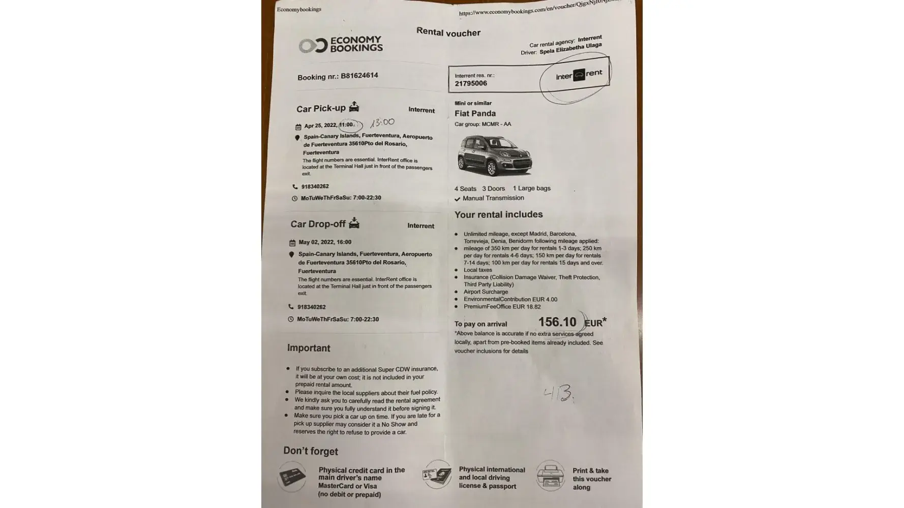 I would like to claim a refund of my rent a car reservation fee in amount of 91,36 eurs on 23.4.2022 which I made via your App Economybookings, Booking NR. B81624614.When I arrived at Fuerteventura Airport and checked at Inter rent office they refused to give me the car because they claimed I came too late (at 17.00 pm)
