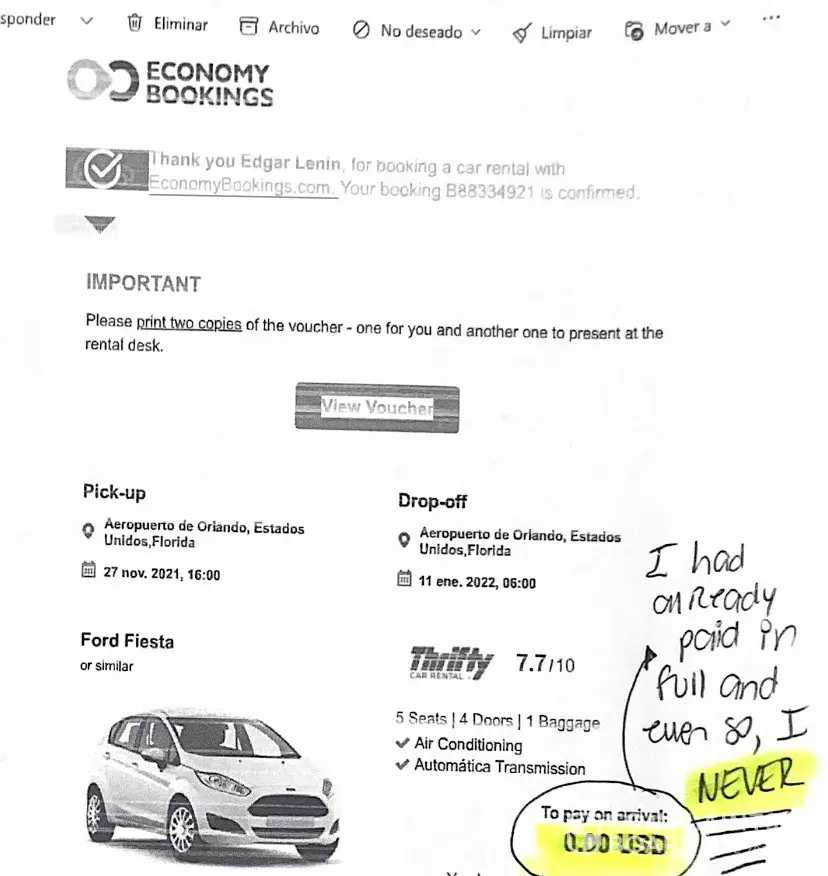 After that, 4 employees at the counter of Thrifty in the ORLANDO INTERNATIONAL AIRPORT ON NOVEMBER 27TH, TRIED TO FORCE ME, MADE ME HAVE A PANIC ATTACK because I needed to pay insurance from them, otherwise I couldn't get the car. And that wasn't what ECONOMY BOOKINGS TOLD ME IN MY RESERVATION, WHICH I'M ATTACHING. ALSO, I didn't have to pay for insurance because I HAVE IT IN MY CREDIT CARD AND THEY KNEW IT. Again, one more time with different words, I had insurance, I paid in full and agents refused to give me the car. I arrived on time, DID EVERYTHING THEY ASKED ME, paid for the deposit and they refused me to give me the car, I NEVER HAD THE CAR I PAID IN FULL AND STILL I DON'T HAVE THE MONEY AND NEVER HAD THE CAR.