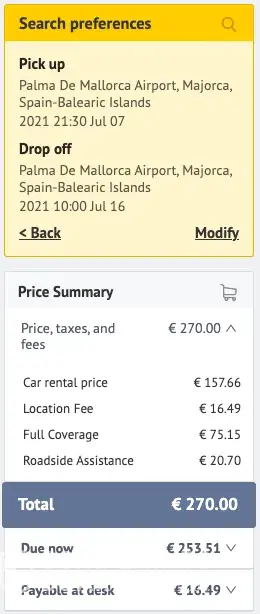 I wanted to book a car for Mallorca, Spain, through the website. While making the reservation online, a Swiss number calls me and tells me to book, saying that an extra fee of 8euros per day should be added for the full insurance coverage. Following the advice, that is what I did. I booked the car, until now, no problem.