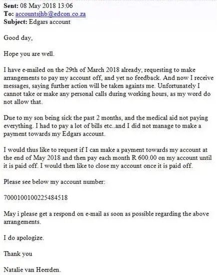 My Edgars account has been handed to attorneys, i contacted the attorneys to make payment arrangements, debit orders has been going off since April. I have requested statements since April but too no avail. Last week 1st August i contacted Edcon to either issue me with statements and a payment arrangement letter.