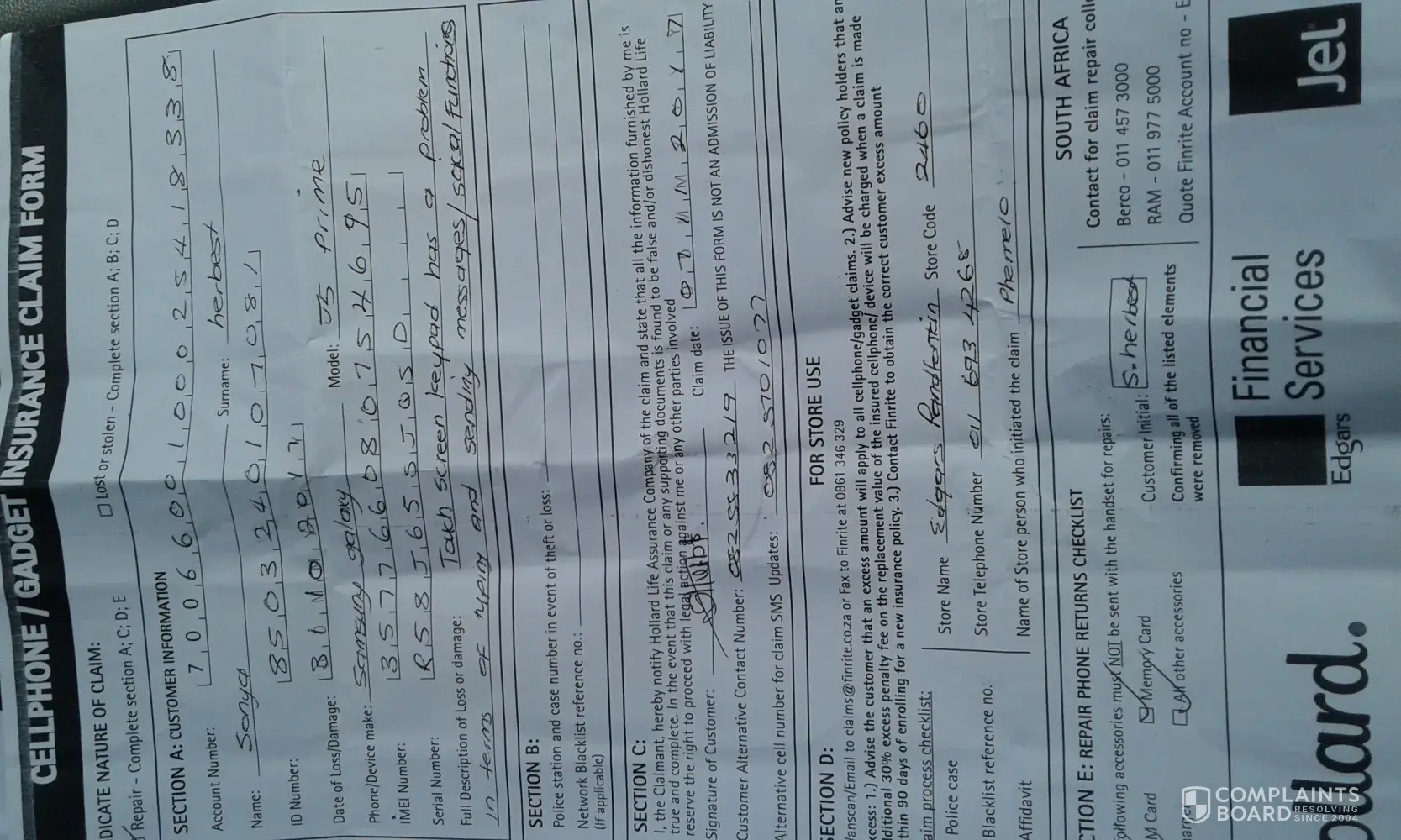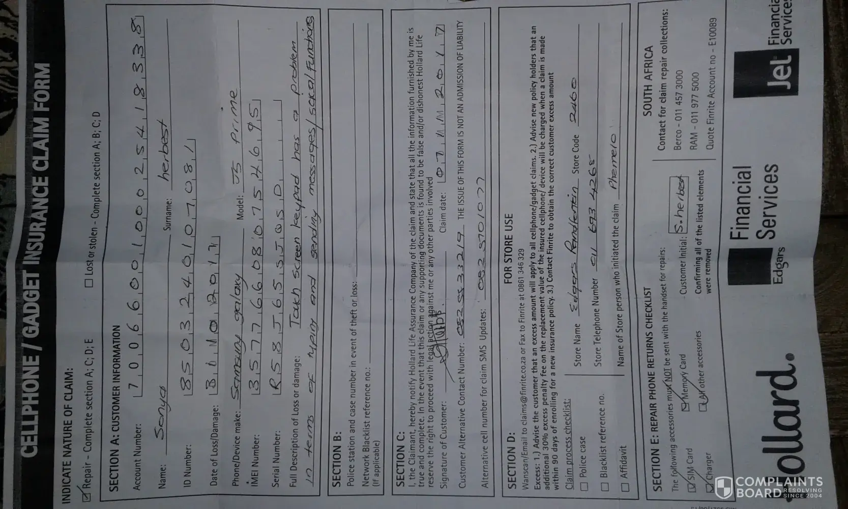 last year December 2016 I bought a SAMSUNG Z2 phone at edgars zevenwact and it lost in november 2017 i went to edgars to submit my claim on the 14th of november because it was insured today the 23rd of november i called the hollard insurance at first they couldn't get anything with my id so i gave the my name and surname and they could pick it on the system but with a different id number and there was no claim that was submitted fro the insurance.