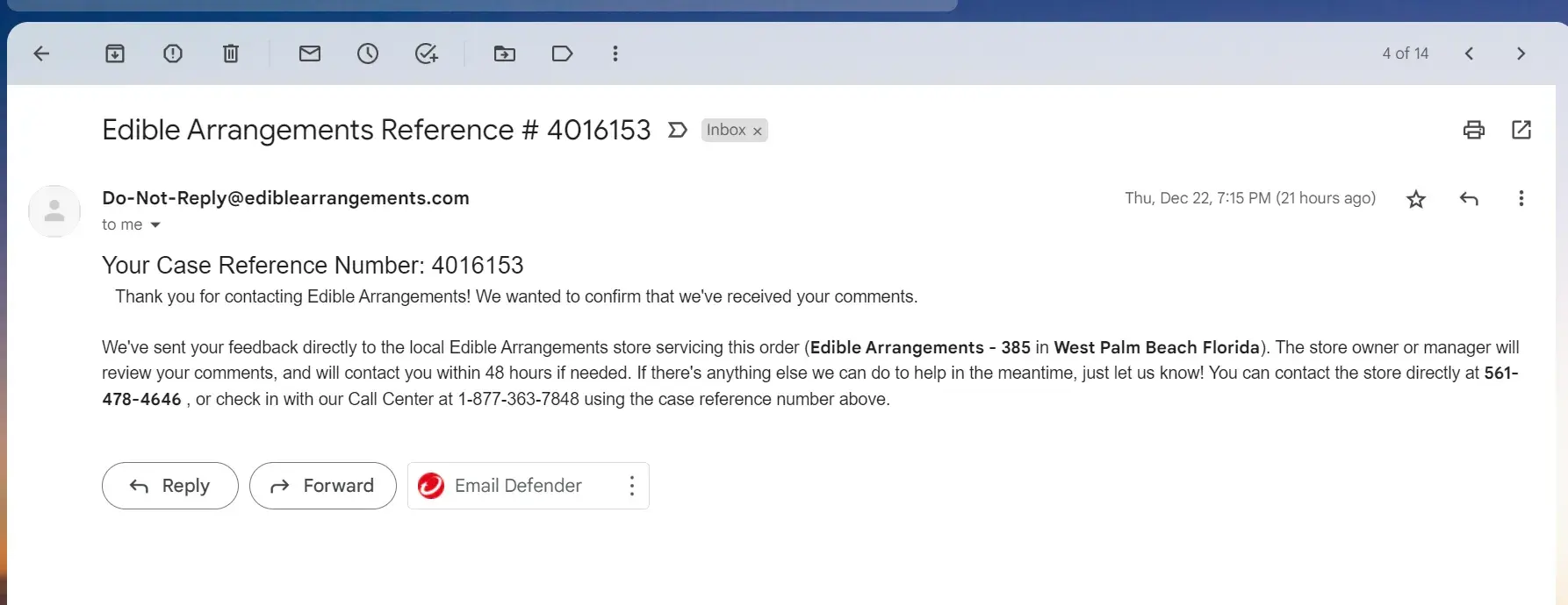 I ordered an arrangement for a friend whose mother passed away. After many phone calls and being told that the arrangement was delivered, my friends husband confirmed that it wasn’t. I called edible corporate office and the manager said she would refund me confirming that nothing was delivered. I was told by several people that it was and received a delivery email. I said but my friend did not get what I ordered for her weeks ago. The manager was rude and hung up on me. I have ordered many edible arrangements in the past but this is the last. I have never had such a terrible experience.
