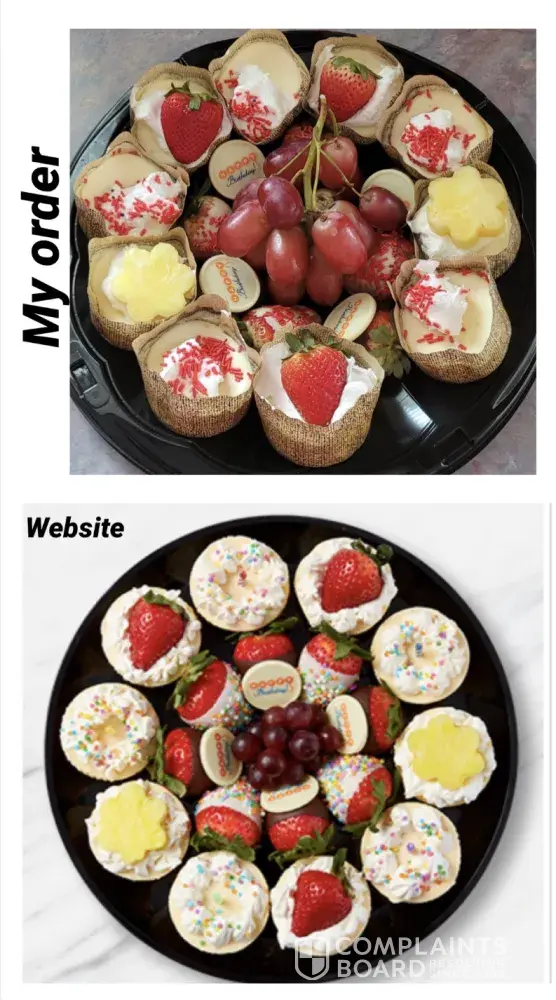 I already called the store and told them items are missing -she said she will either call me or email me. Nothing yet. I had ordered four different edible arrangements to go to four different places. I understand you have to use different platters, trays, whatever. I expect it to look good and be presentable. I pay enough money and would like it to be close to the picture as possible. This is your business-I am not being unreasonable, I want what I see and what my recipient gets to be the same!