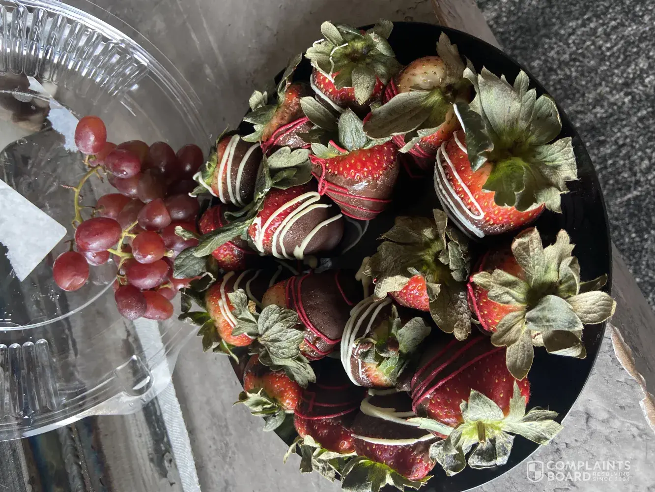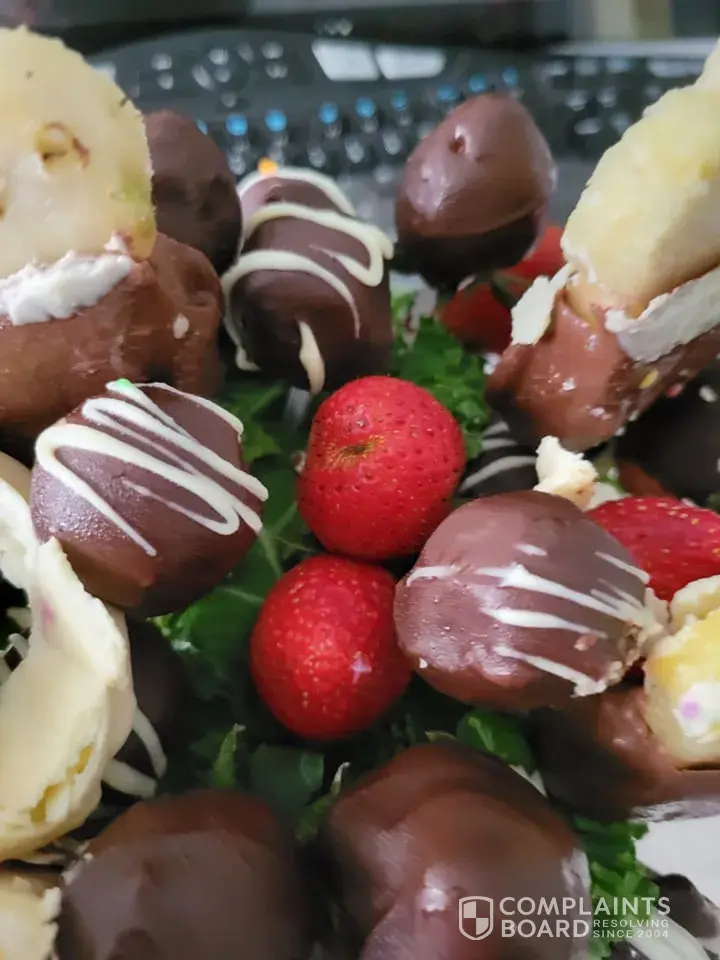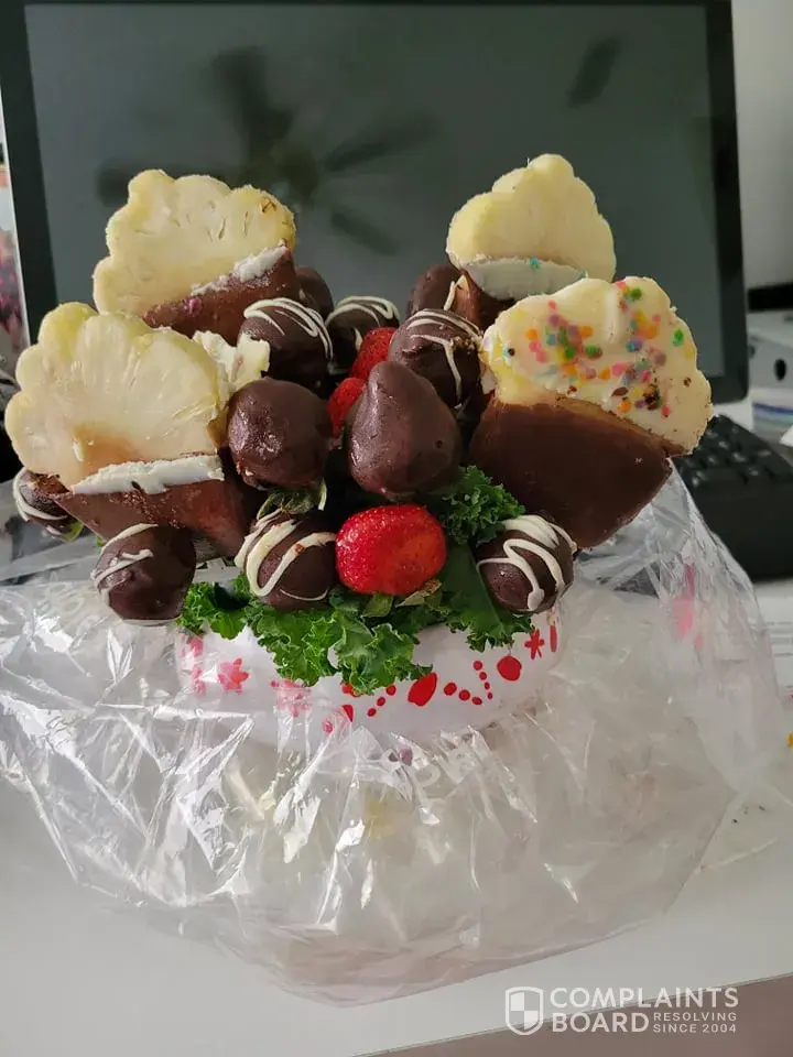 informed by the recipient that her edibles were left outside and by the time she got to her arrangements, the fruit was no longer good. (It was left outside in 80-degree weather)