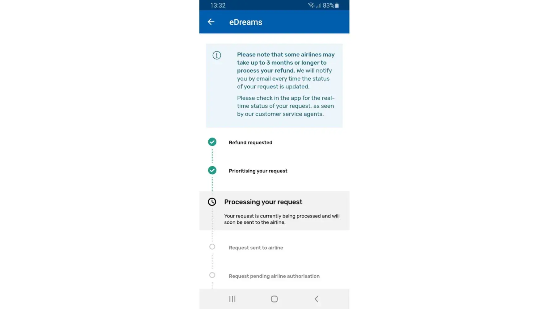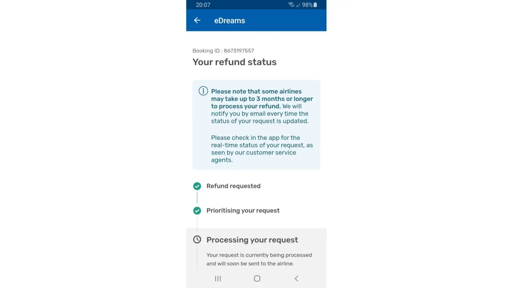 Following up on the case for over 2 years I requested a refund. eDreams have told me they are pending airline authorisation to release a refund. I patiently wait another half year all the while asking for updates and getting none. Any and all calls with them were a similar case: they said they were working on it and would have an update soon.