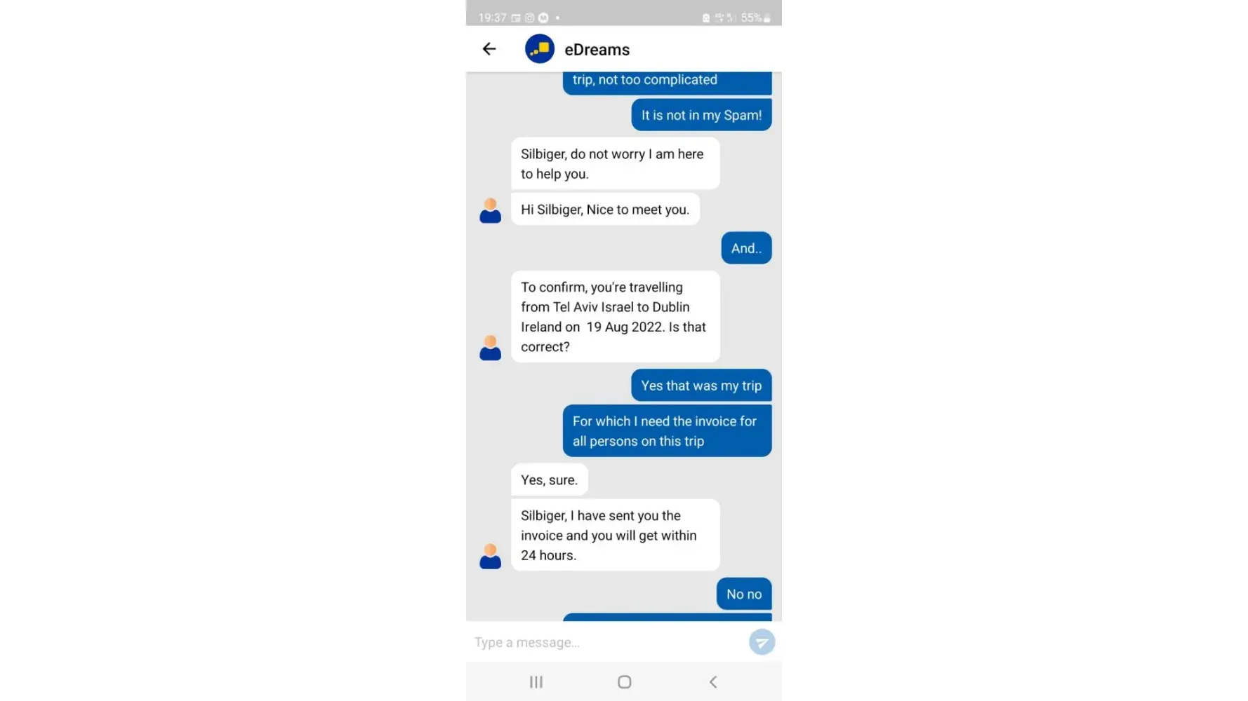 On the 19th of August I had flight to Dublin which had been ordered via eDreams. After I arrived, I have requested via their app to send me the the invoice several time as I have to be reimbursed by my employer on that trip. I didnt get it. Approached them via the chat and although I was promised to get it by their rep within 24 hours (called Amit Roy) - I didn't get it. Tried a day later where I was promised to get it within 24 hours. Didn't get it. Afterwards they came up with stories that there are "technical issues". Bottom line - they don't send the invoice on time and I guess there is a reason for that. This is completely illegal.