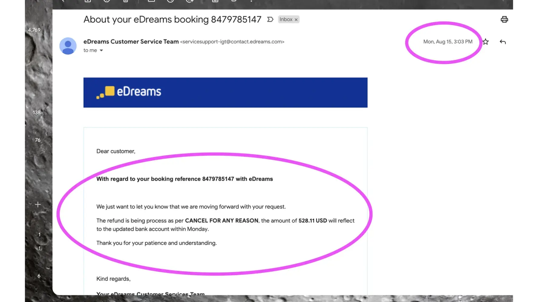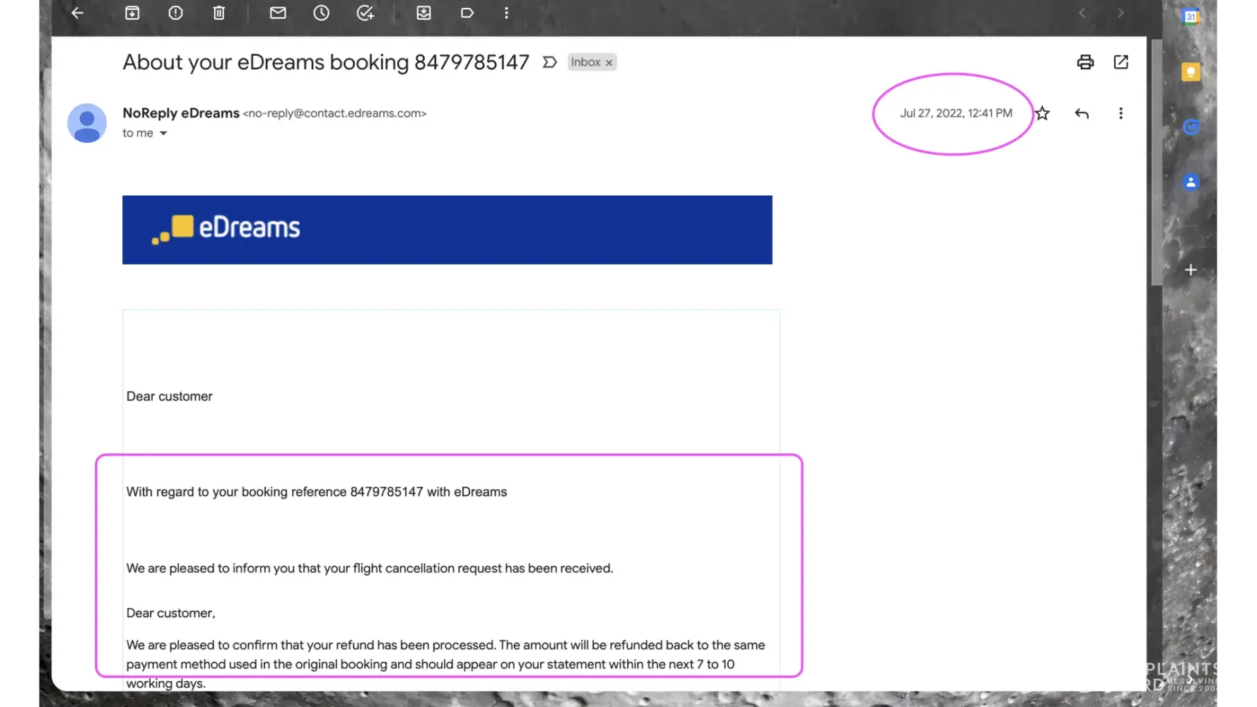 Desired outcome: I am seeking my full flight refund of $621.127 from e-Dreams as purchased.