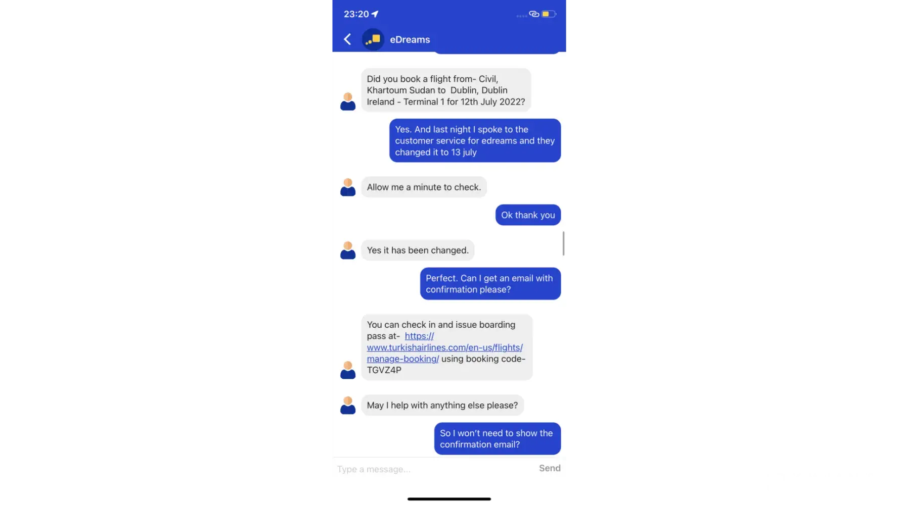 I had a modification in my flight from dublin to khartoum from July 12th to July 13th and had to pay an extra 500 euro for the change. However, when i arrived at the airport the staff told me that the ticket had not been changed in their system and i was unable to board. After, i spoke to an agent through their chat system regarding this issue and they said they would change the flight to the 15th and guaranteed that the same issue would not arise again. However, yet again I arrived at the airport and was told that my ticket had not been properly issued. As a result, I have now missed 4 days of work in dublin and counting.