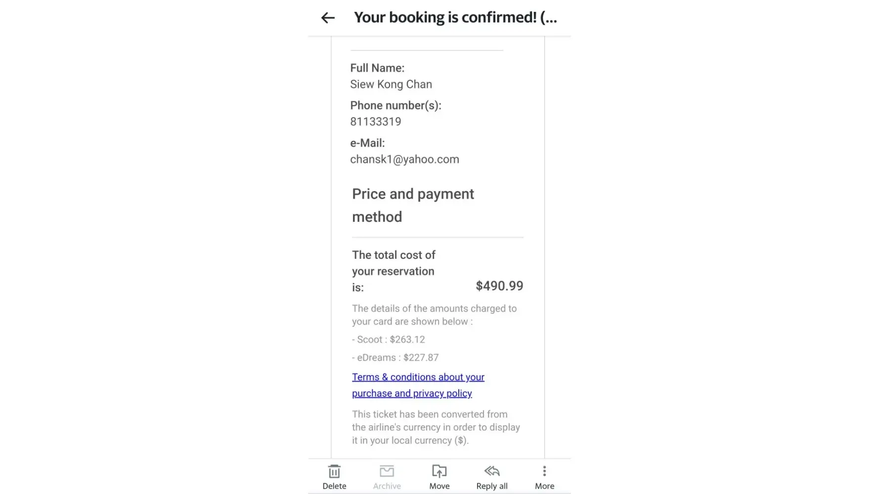 I've an email confirmation that the total cost of my reservation is S$490.00. (see attached below). It is stated clearly that the display is in my local currency ie $ (Singapore dollars).