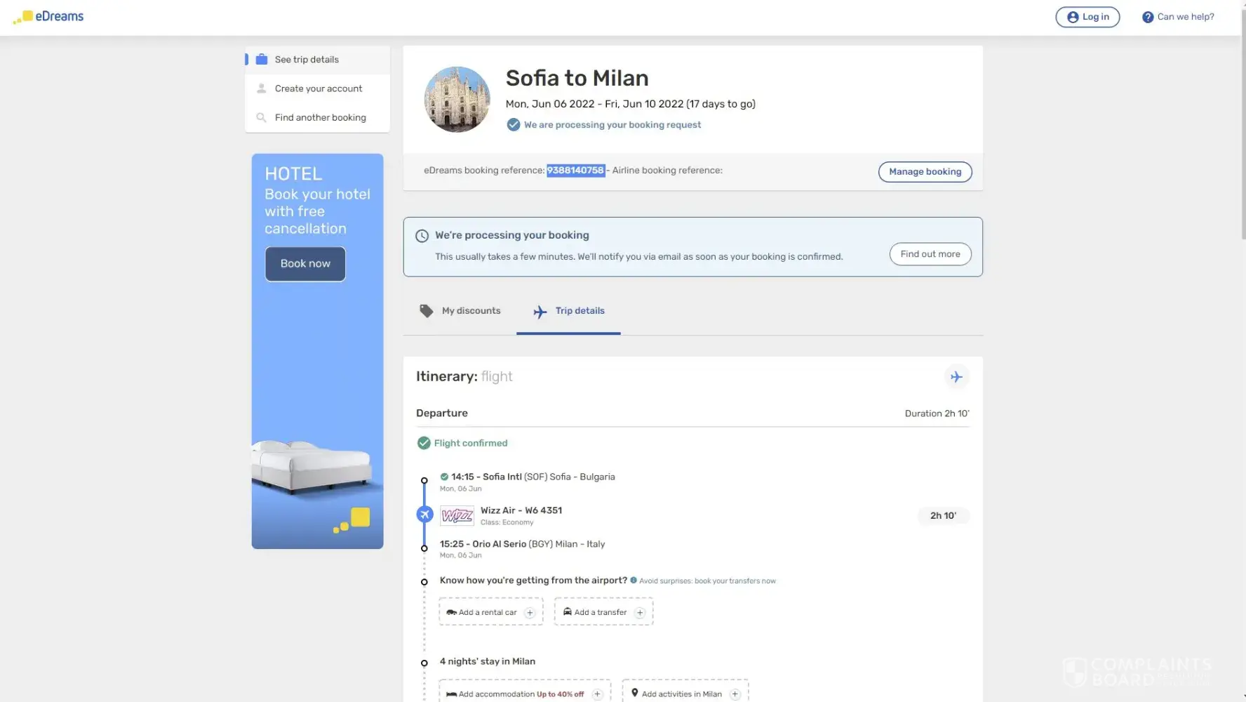 Desired outcome: I would like eDreams to include carry-on bag in my trip at their expense