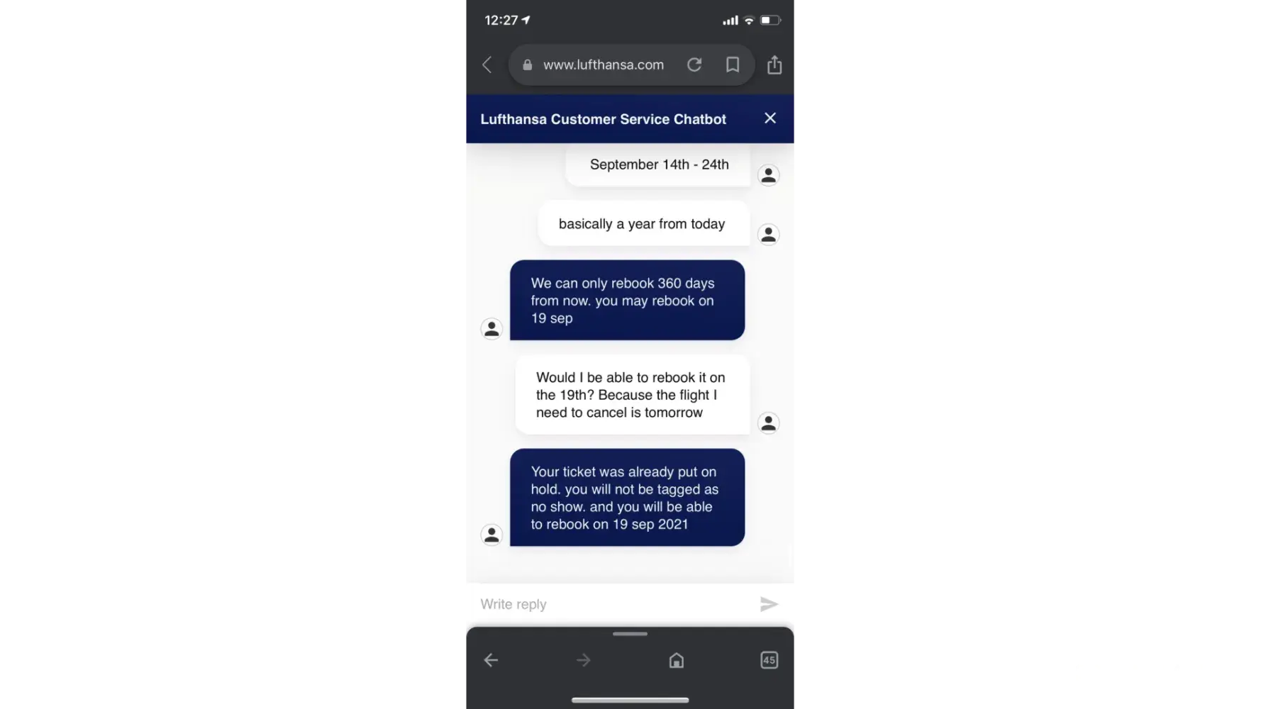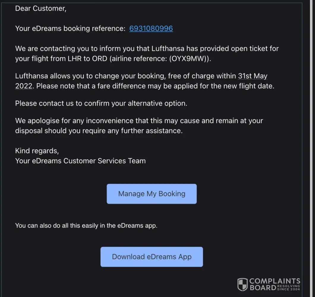 Purchased tickets to fly to Chicago 15/09/21 until 25/09/21. Unfortunately USA still had their borders closed due to COVID-19 so I couldn’t get into the country. I had purchased change of flight insurance and edreams and the airline Lufthansa assured me my ticket was on hold for a rebook. I even received an email from edreams stating I could change my flight date. However now when I phone edreams they bluntly tell me I was a no show (even though I rang a week before the flight stating the issue) and that I can’t change my flight or get a refund. Again I have written proof of them and the airline telling me I can.