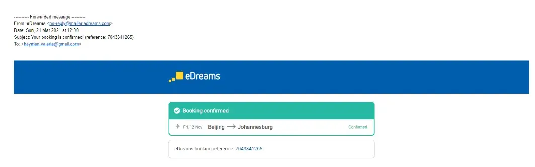 I attach all the information and confirm that I have booked my ticket from Beijing, China to Johannesburg, South Africa on 21 March 2021. The flight details are as follows: From Beijing to Johannesburg on Friday, 12 November 2021.
