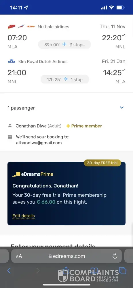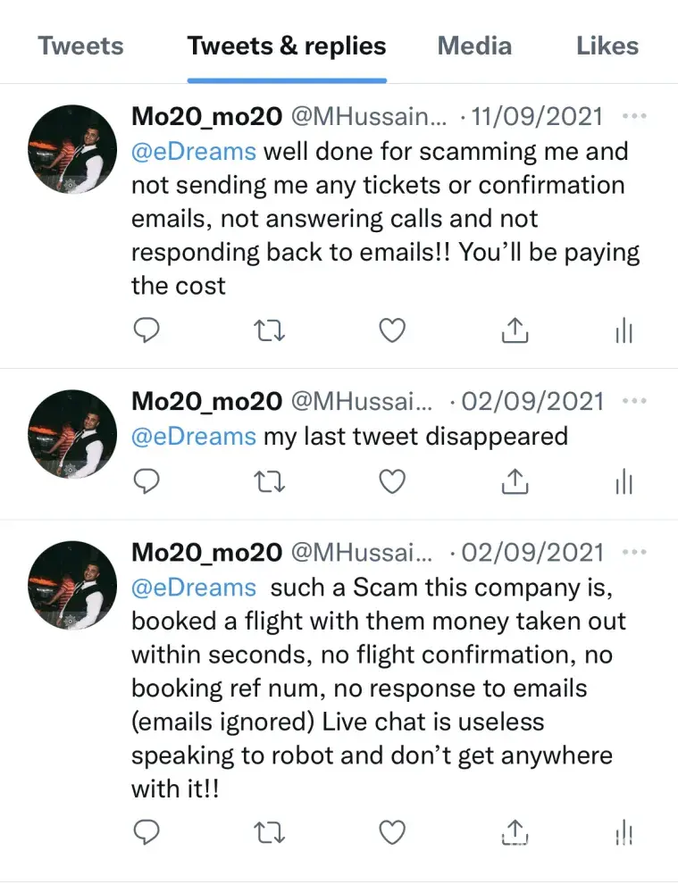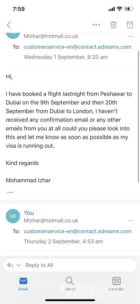 I booked a flight with edreams and as soon as I put my card details the money went out straight from my account, I didn't get no confirmation of emails or anything not even flight times and E ticket, I contacted them via email sent 2 emails it's been 2.5 months still no response to my emails I left messages on Twitter and still no response couldn't find any numbers that would work, I contacted my bank and when they contacted edreams they sent out proof of flight to my bank but yet they never sent me that when I provided my bank with proof of my emails they backed down, this company is one of them biggest scam company exist, but I promise you one thing I know you're based in Spain I will file a legal case against this company in Spain I don't mind paying any cost towards this claim because I looked online and this issues been going on for years, name Mohammad Izhar