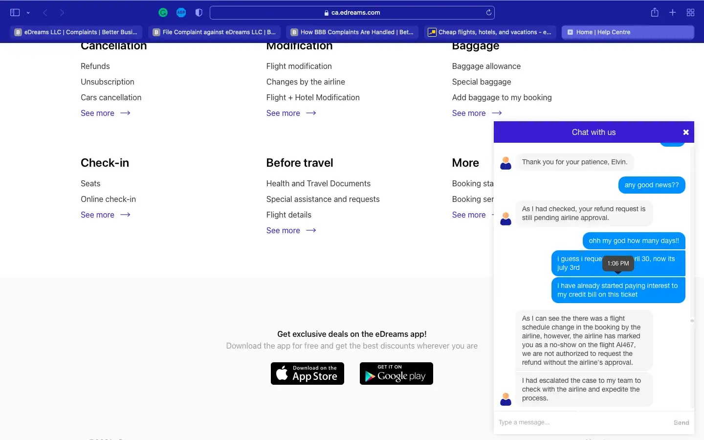 Hello, I would immensely appreciate your help with getting me my refund, promised by eDreams on 23 June of this year.