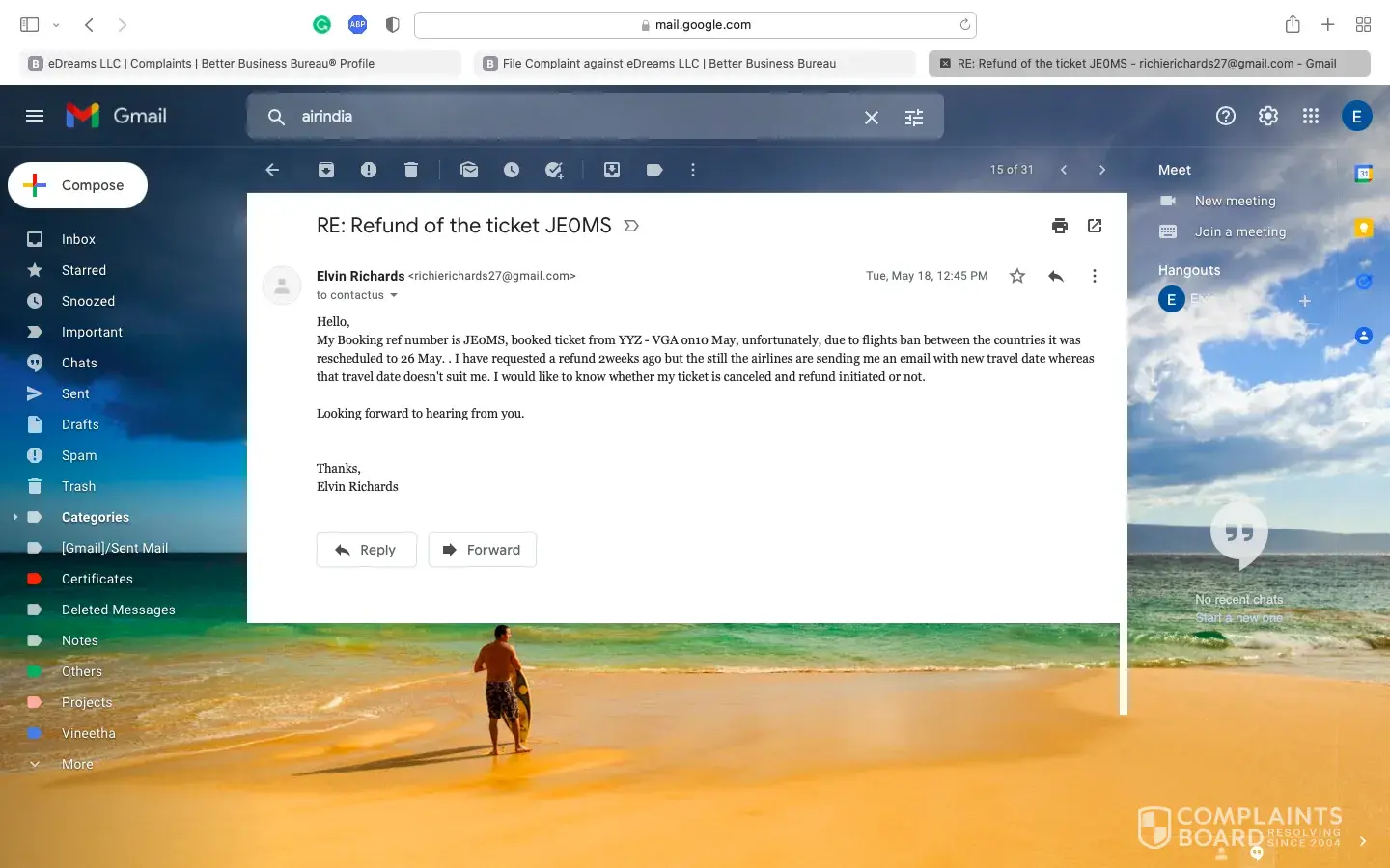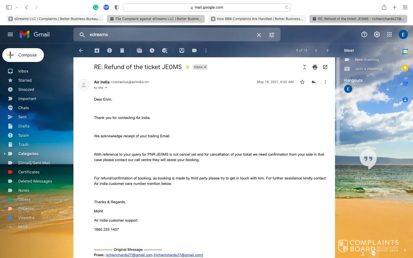 Booked ticket from yyz (india) to del (india) to vga (india) for 10 may 2021, booking ref : [protected] due to flight ban airlines cancelled the ticket, since there is a ban I couldn't able to fly del (india). So airlines marked as no show at del (india) and closed my case. How can that be possible. How can I travel to del without any flights, and I immediately requested refund once flight ban is announced edreams said it will 90 days, it been 6 months I am still waiting for the refund. I ve contacted airlines was saying tell travel agency to contact us directly. I ve reported the same to edreams they were saying we are not able to contact the airlines. I am calling them everymonth still there is no update. This edreams stole my money.
