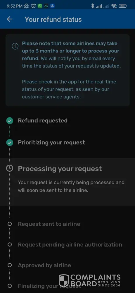 23 June, received email from eDreams : "Airline has approved refund, and we await your refund in cash … airlines take up to three weeks to refund. We will inform you once we have received your refund"
