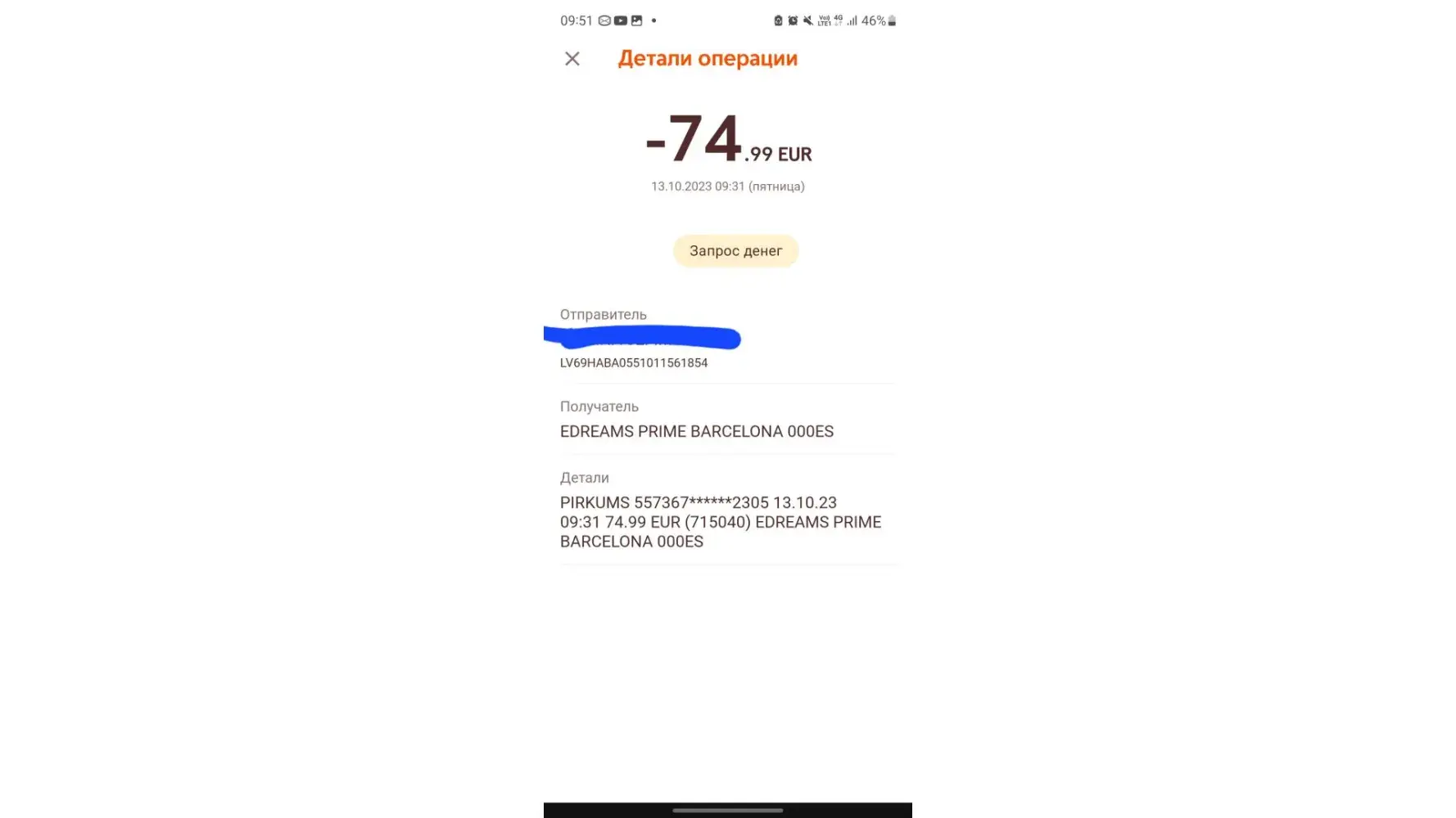 I have bought airlines tickets from Vilnius to London and back (2021.09.[protected]). The amount was debited from the account (amount 74.80 eur).