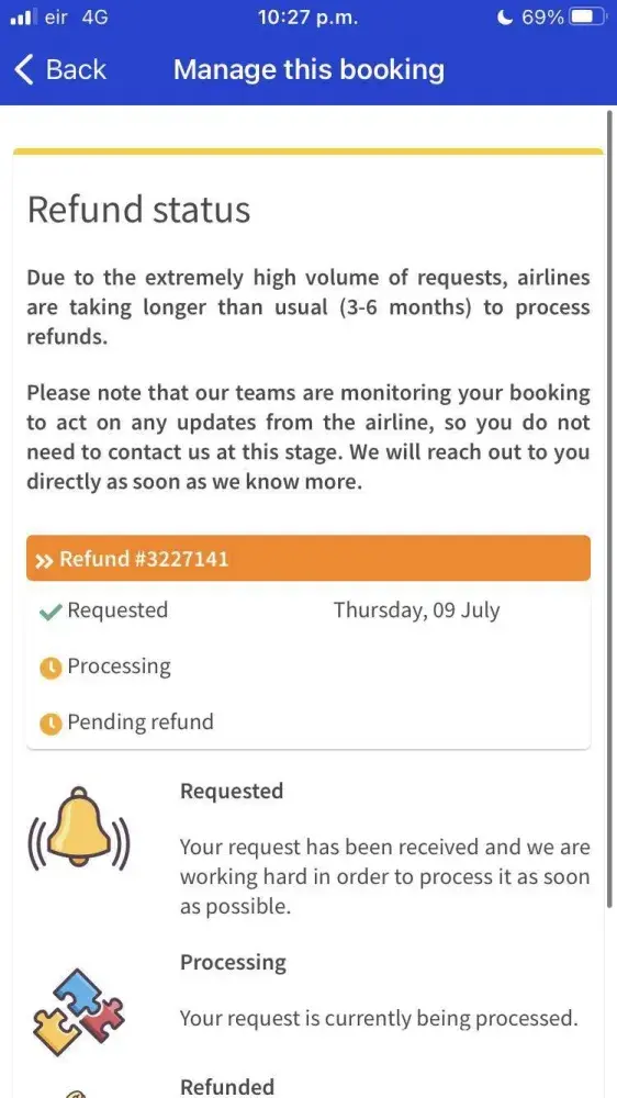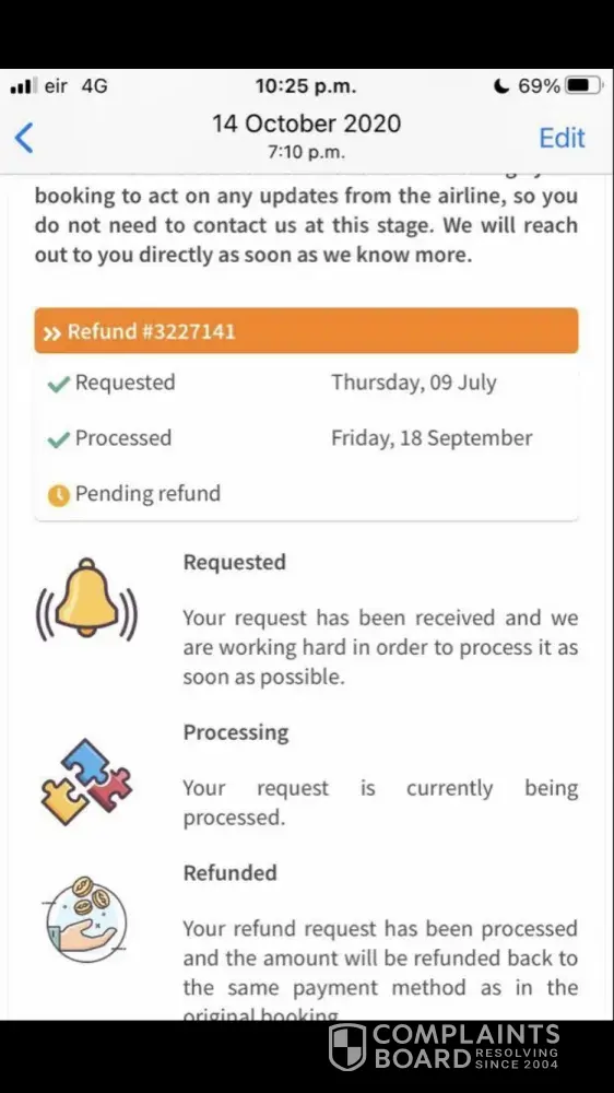 On 4 January 2021, I emailed eDreams customer service team. On my eDreams app, my refund status had now reverted back to 'Requested' (evidence below). It had been 'Processed'. eDreams changed the status of my refund without making me aware.