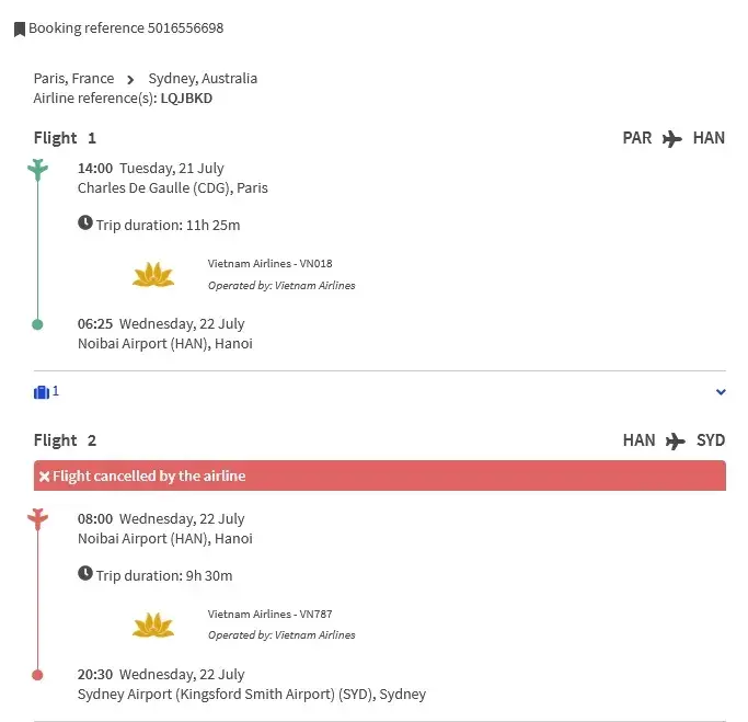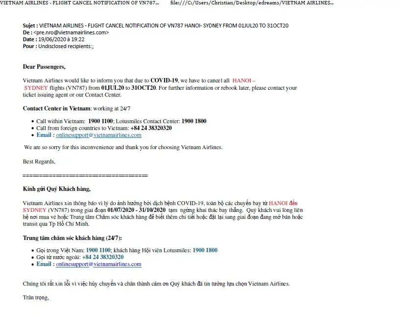 by Vietnam Airlines : VN018 (21 July 2020) and VN787 ( 22 July 2020)