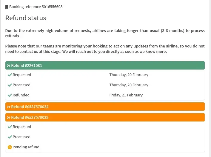 On 6 March 2021, I clicked into the eDreams app to check on my refund status. I could no longer manage my booking and check my refund status. A blue banner stated that my case has been resolved (evidence below). It has not been resolved as I am still awaiting my full refund of 2788.71 EUR.