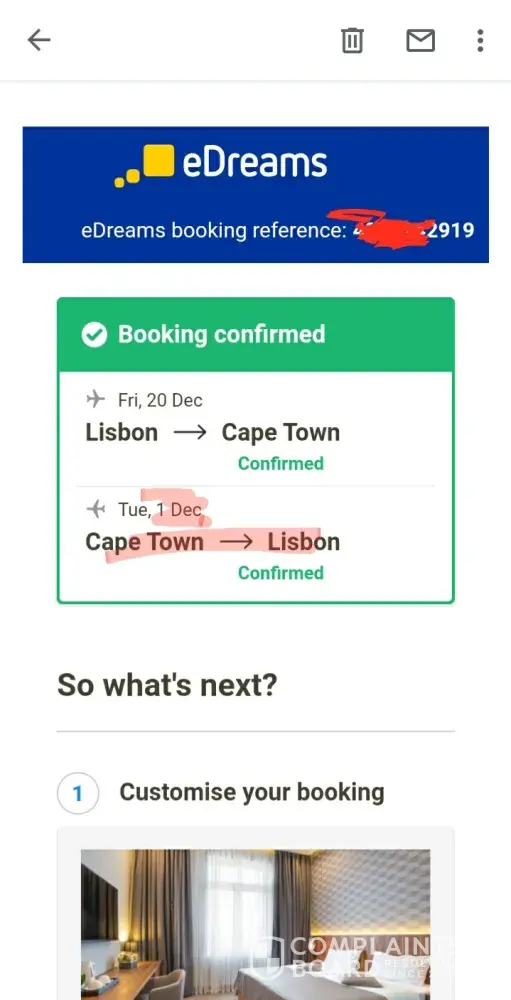Booked a flight with edreams on the 19.12.19 from Lisbon to Cape Town on the 20.12.19 and a return flight from Cape Town to Lisbon on the 01.12.2020. I paid approximately EUR 1600. In August 2020 I got an email advising that my flight got changed. I got another email in September that it got changed and in October I got an email that I will be refunded. In December I got an email that I got a refund. However no mention of amount and on my bank account I cannot see the refund. Due to Covid I expected delays so waited a couple of month before reaching out to them again. I ask if they can advise me about my refund as I haven't recieved it nor do I know the amount. the email got ignored. I then spoke to the customer service team who advised that they cannot see my flight for the 02.12.2020 and that I am not entitled to a refund as I taken the flight on the 20.12.2019. I advised that there are two flights and that I can send them my confirmation email. Every time they just hang up! (I can give you time of calls so you know I am not making things up). No money for the flight they have cancelled and no one that wants to help me with it