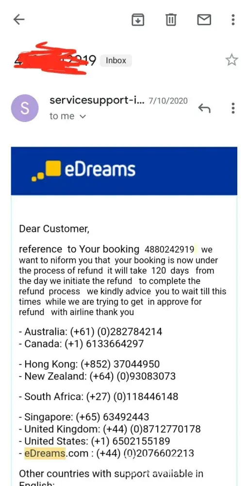 Initially, I was told by eDreams of a 90 day refund period from the date of the refund request. This 90 day period was up on 7 October 2020. As per the latest description on the app, refund periods can take 3-6 months. The 6 month period from my refund request was up on 9 January 2021. It is now 6 March 2021 and I have not received my refund.