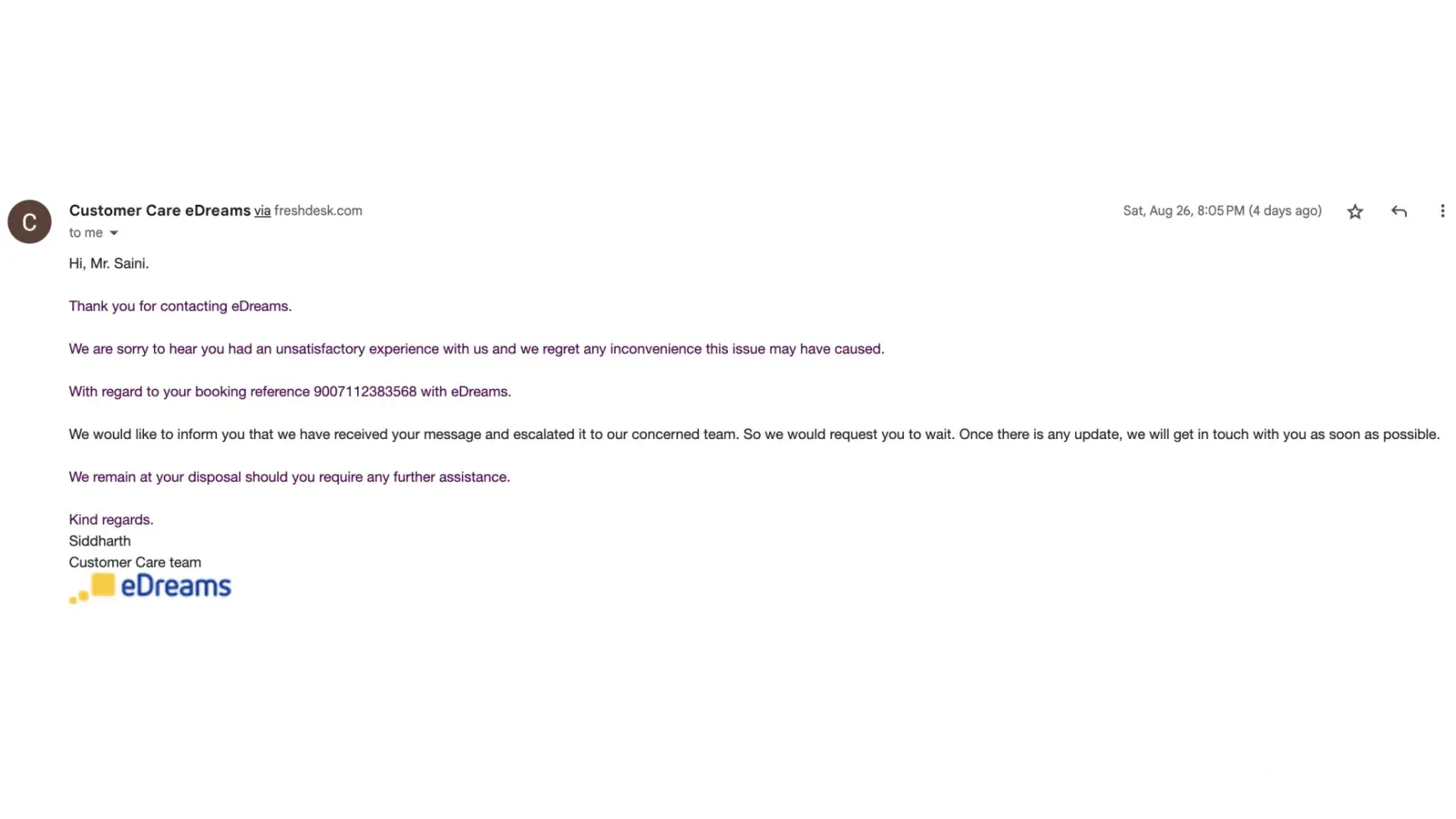 Secondly, after 2 weeks, I got a response from the eDreams customer support person(Siddharth) saying that they found accommodations booking reference numbers and escalated to the accounts department.