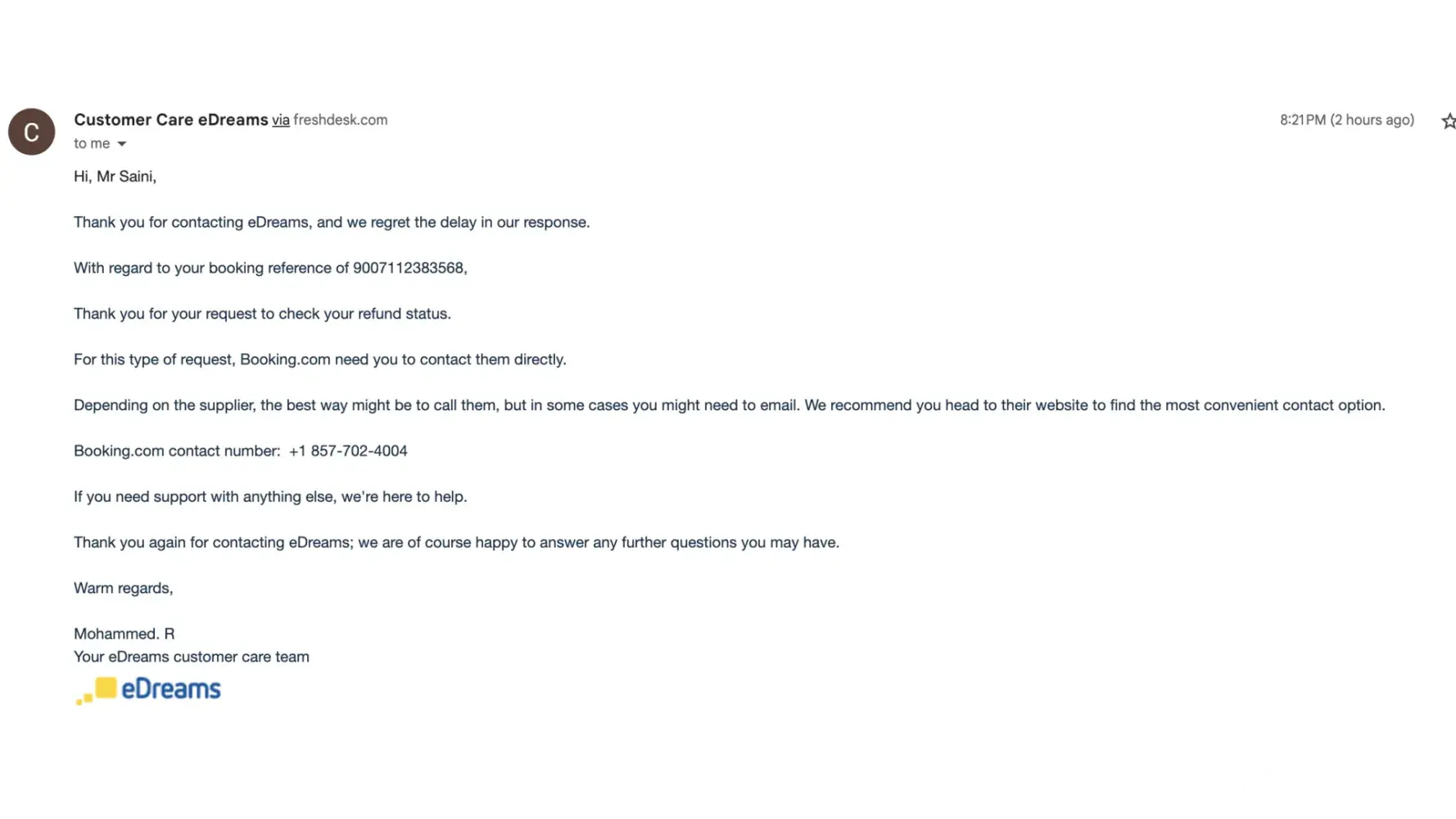 A few days later, I got one more email eDreams customer support person(Mohammed) saying that I have to reach out to Booking.com for my refund. He provided me Booking.com contact no +[protected] in the email to get my refund. As per Mohammed's suggestions, I called Booking.com and they said we don't have such booking details and any partnering with eDreams.