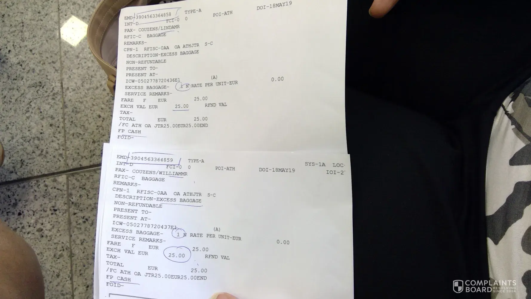 As per below email we are still waiting for refund of the 50 Euro we had to pay for luggage for our trip from Athens to Santorini. Please find attached receipt issued by the airport staff. If we do not receive the promised refund within seven days I will have no other choice but will go to the ombudsman to seek help.