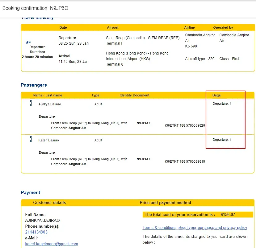 I made a booking for January 28, 2018 from Siem Reap, Cambodia to Hong Kong on Cambodia Angkor Air via eDreams. [Booking reference: [protected]] The ticket was advertised as First Class. When we received our confirmation email, it confirmed that it was 'Class - First' and under 'Bags' is listed Departure: 1 next to both mine and my husband's name. This was a one way flight so we figured this was the included bags.