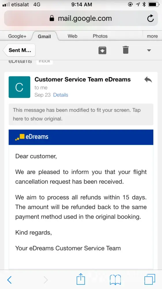 Dear EDreams, the airline have canceled the flight and my tickets got canceled, I have received from your customer service an email assuring that I will get my refund by 10 of October, I am following up with your customer service by emails since then with no reply, until