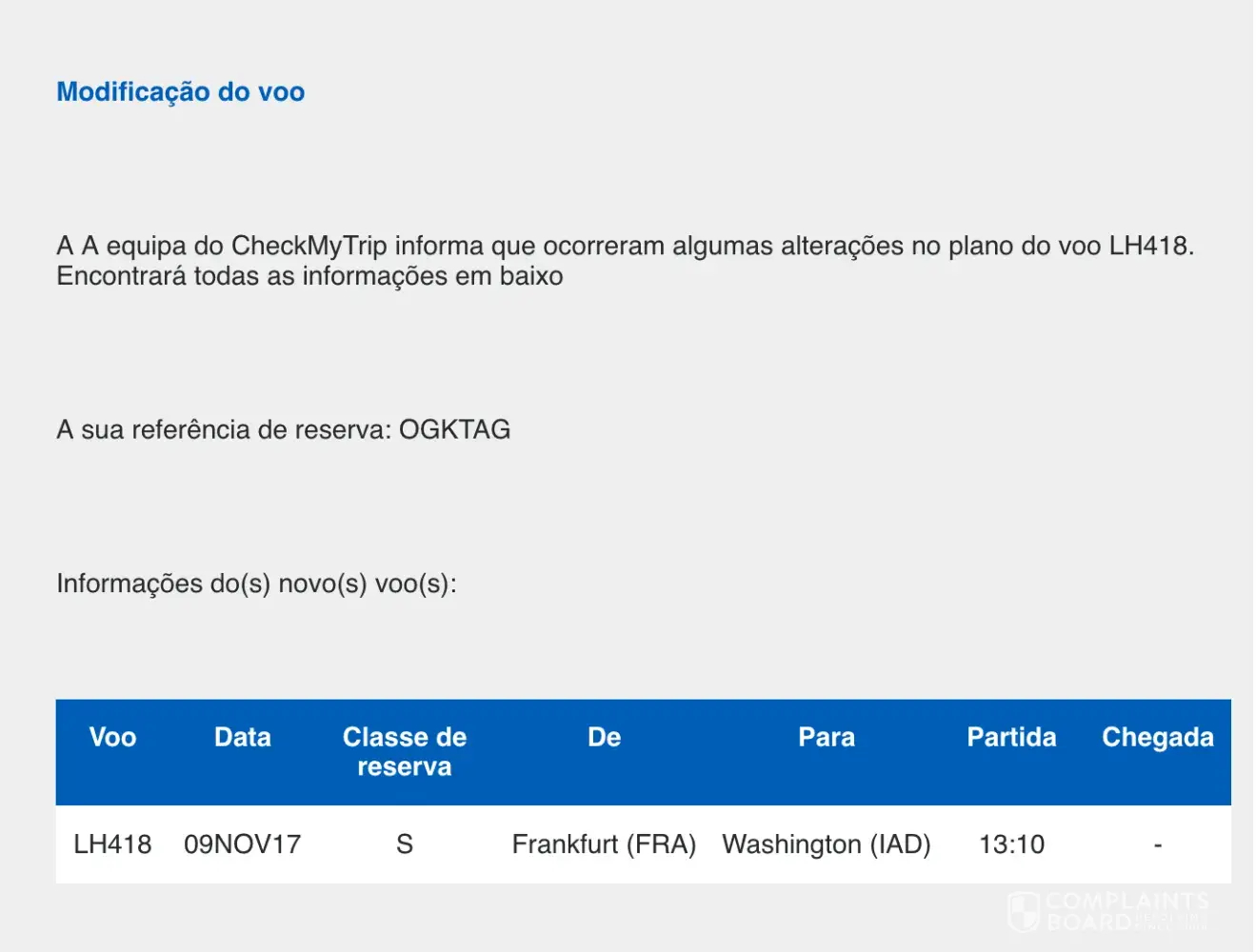 I got to Washington and with some surprise I got this email (exhibit 4) on the 7th of November, stating that a flight from Lisbon to Frankfurt was scheduled to leave on the 9th of November. This is obvious an error from Edreams since I was already in Washington and explicitly said that I didn't any of the options the agent offered me. It's on record.