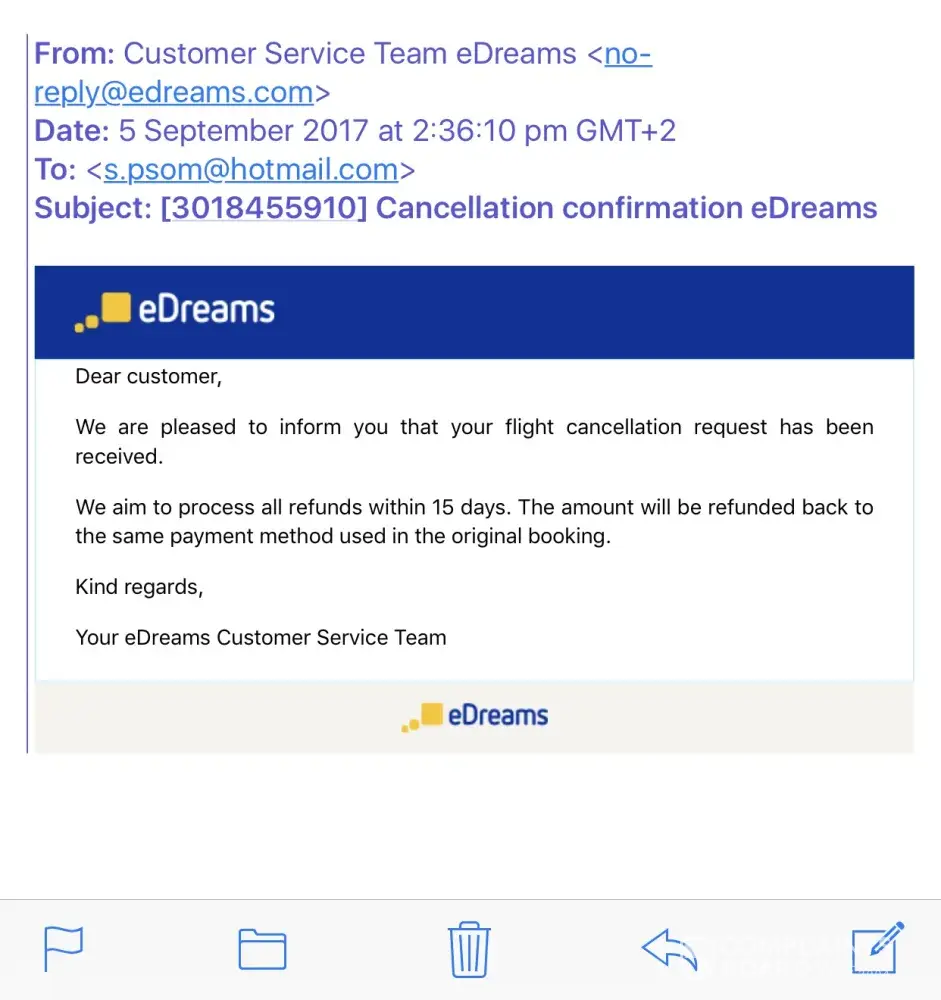 On 5th September I booked to travel to London from Athens. Within 15 minutes of making the booking I requested a cancellation as travel plans had been changed. After almost an hour on the telephone with edreams customer service I received a confirmation for refund request. It stated this would be processed within 15 days. I also received email from Ryan Air advising me to check in on line for the flight that was cancelled ! I emailed Ryan Air advising them that booking had been cancelled. They are quick to take your money but 2 weeks later I'm still waiting on my refund!
