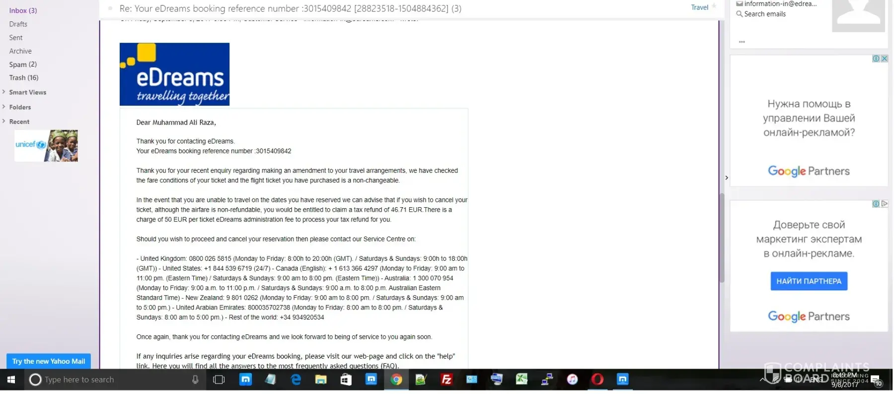 eDreams Customer Care's Response, Sep 13, 2017
