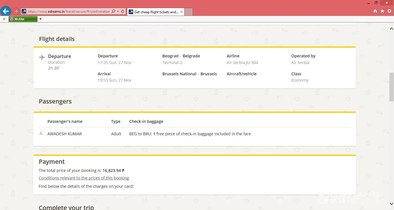 I have booked the tickets from edreams for Air Serbia fromBelgrade to Brussels for the date 27 Nov 16. The payment has been done thru credit card but neither I got the ticket nor confirmation. Details are