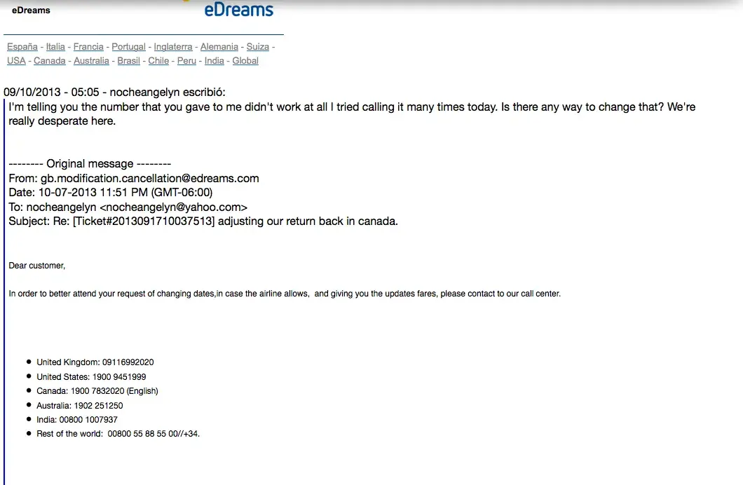 and not Sydney in Australia. I am still baffed as to why Sydney in Canada has been picked as I entered Sydney into the search engine, and it populated automatically as the website was (http://au.edreams.com/) for Australia... Immediately upon noticing the error I have called eDreams customer service on phone number [protected] which was provided on their Australian website for Australian customers. This number unfortunately is not an operating number and it does not work, I was left with