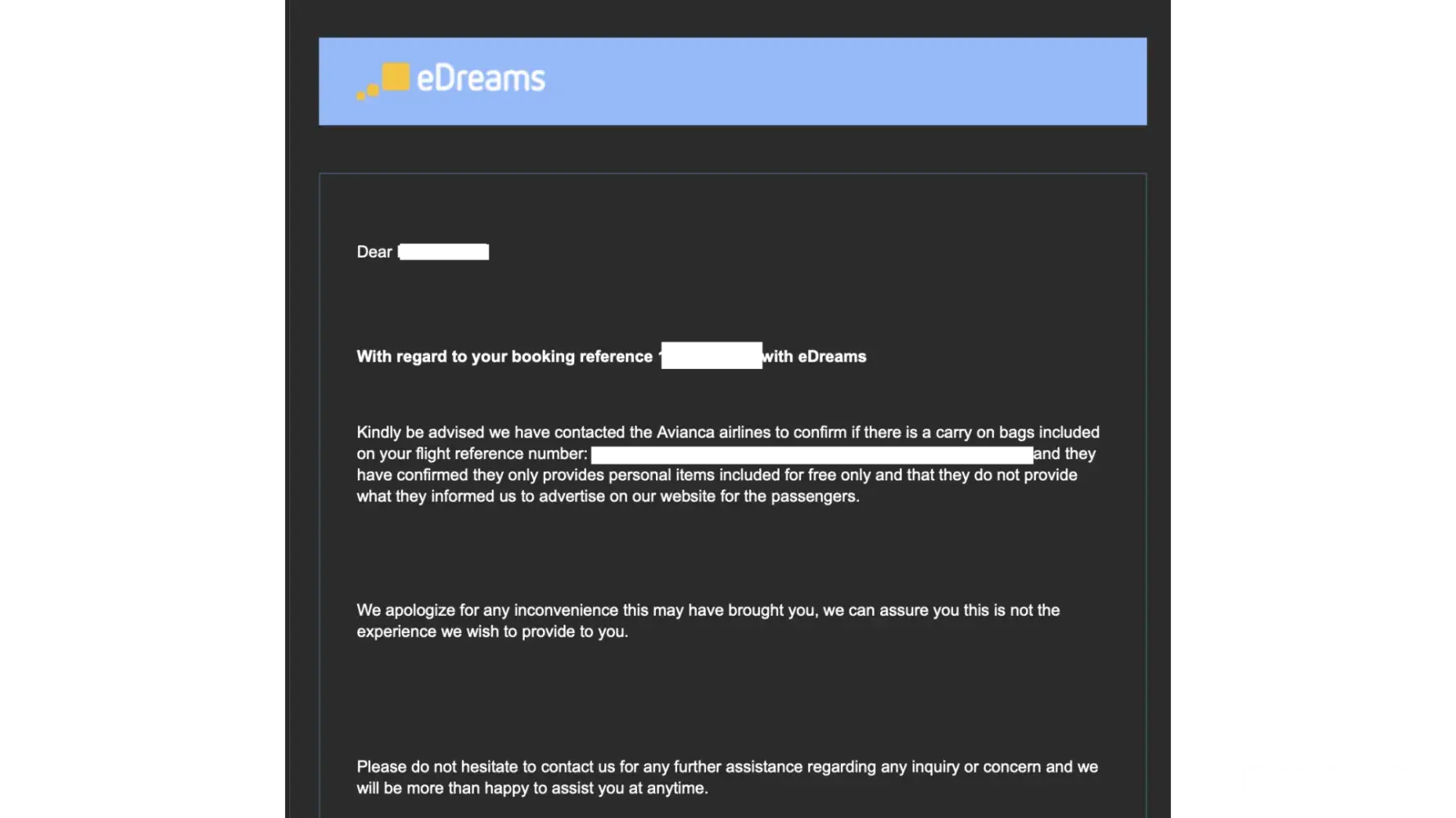 When we approached eDreams we were told by your reps that they (eDreams) would contact the airlines directly. The agent then sent confirmation that eDreams had spoken directly to Avianca and that